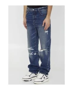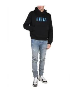 Amiri Black Skinny Jeans With Crystal Embellished Logo And Used Effect In Stretch Cotton Denim Man