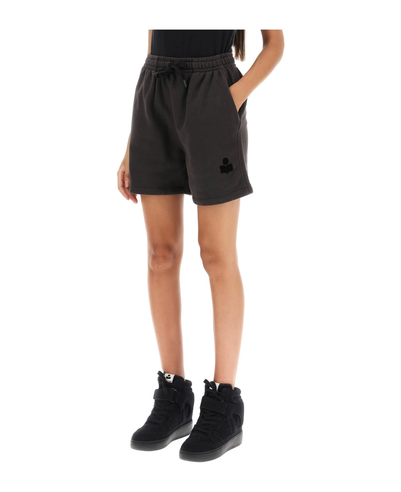 Marant Etoile shorts crafted in faded-effect organic cotton blend french terry. They feature elasticated waistband with drawstring, side slash pockets and a faux welt pocket at back. Decorated with flocked logo on the front. Relaxed fit. The model is 177 cm tall and wears size FR 34.