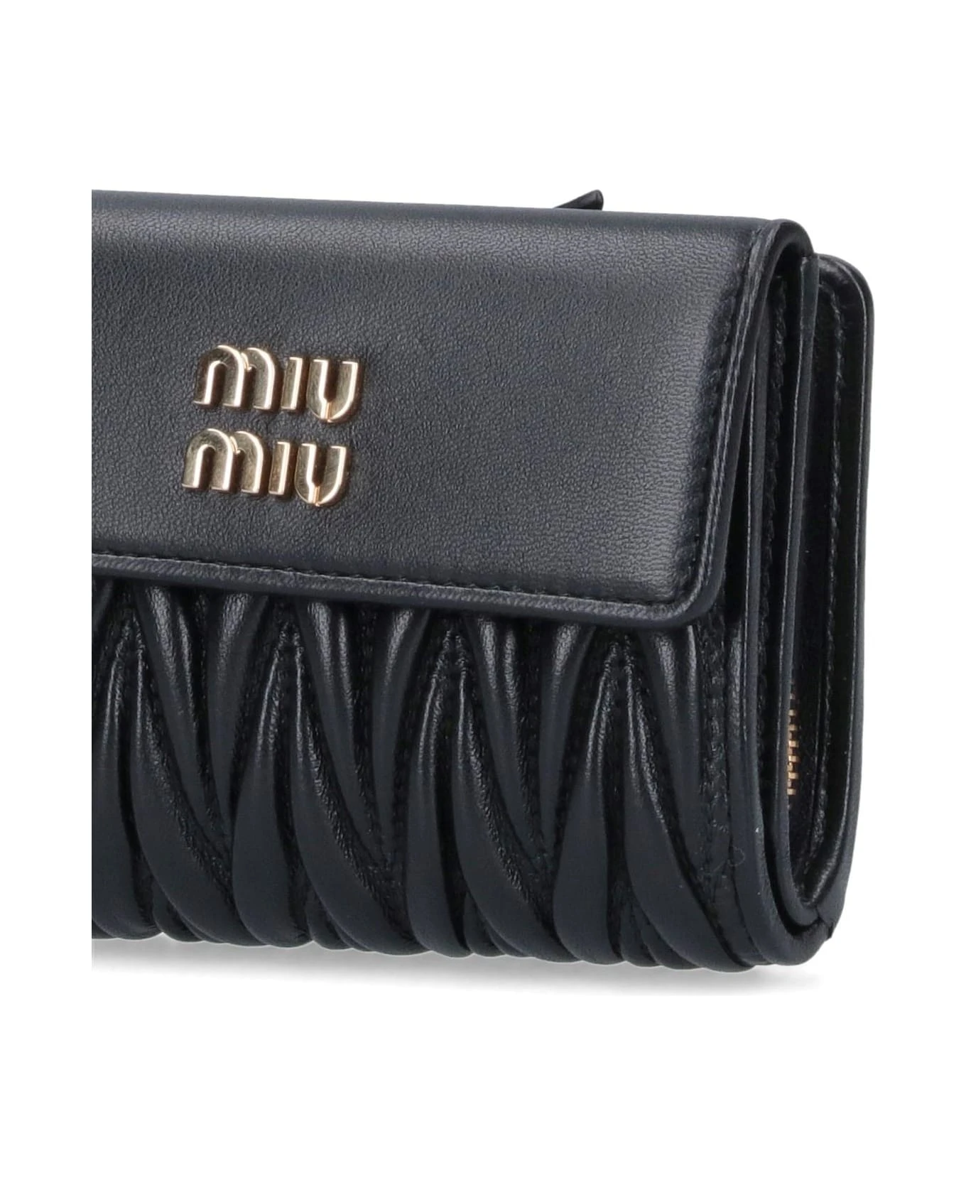 Miu Miu small matelass allet in black leather with snap button flap closure, gold metal logo lettering patch flap, bill compartment, four card slots, four inside pockets, and zipper coin pocket.