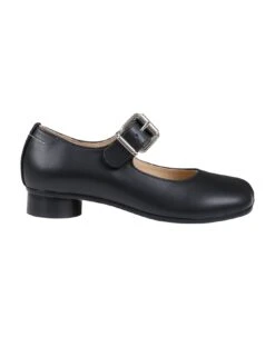 Black leather ballet flats, with leather sole, strap and buckle, asymmetrical toe, cylindrical heel. They are embellished with stitching on the back.