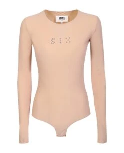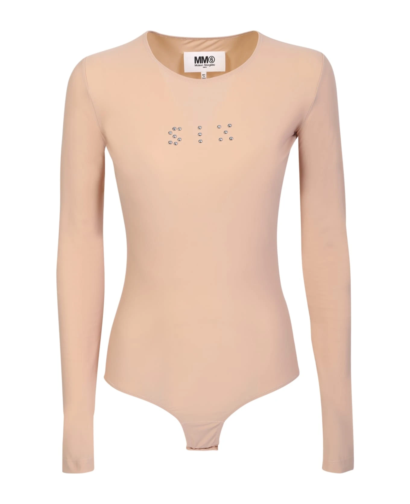 Roundneck. Long sleeves. Concealed fastening. Stud embellishment. Stretch design. Silver tone hardware. Color: nude