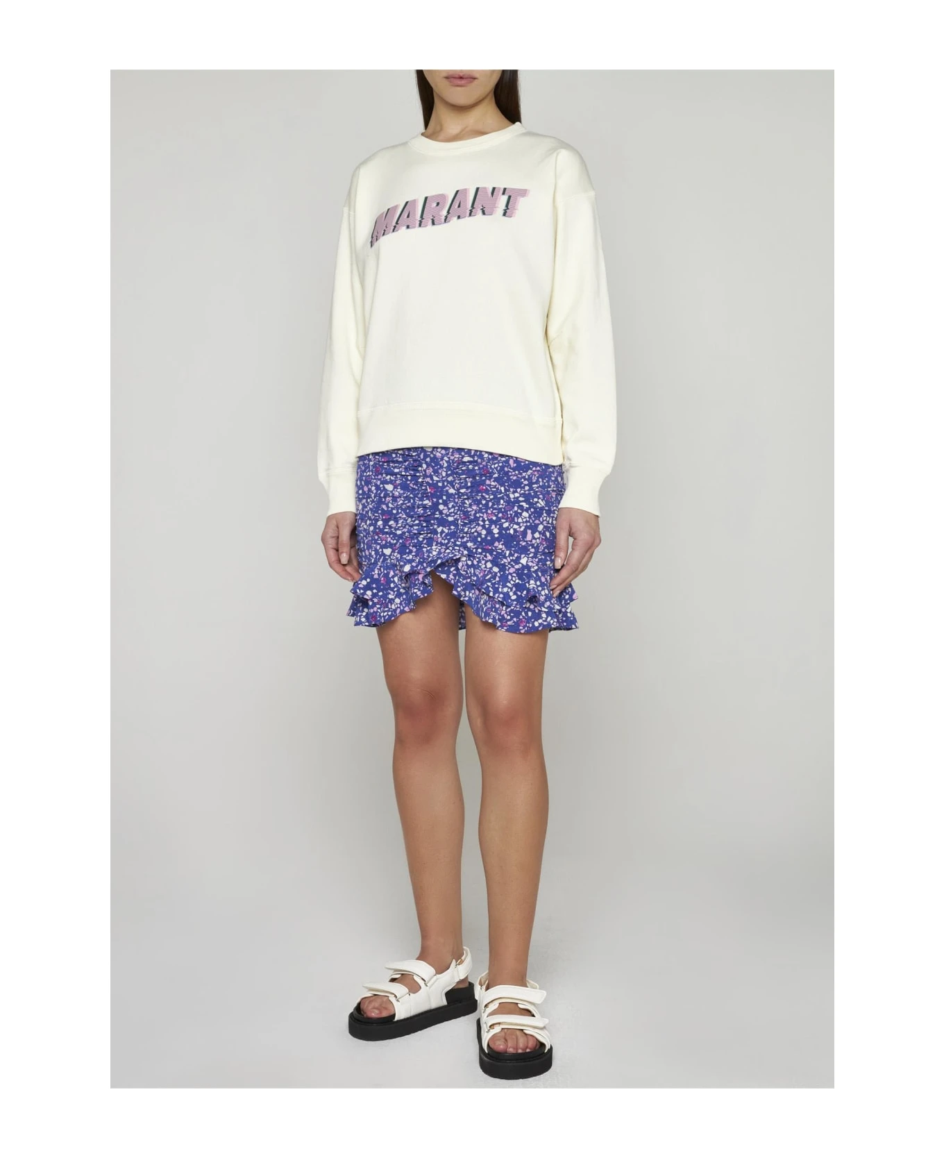 Isabel Marant Etoile’s Mobyli vanilla cotton blend sweatshirt featuring a crew neck, logo printed on the chest, dropped shoulders and ribbed edges.