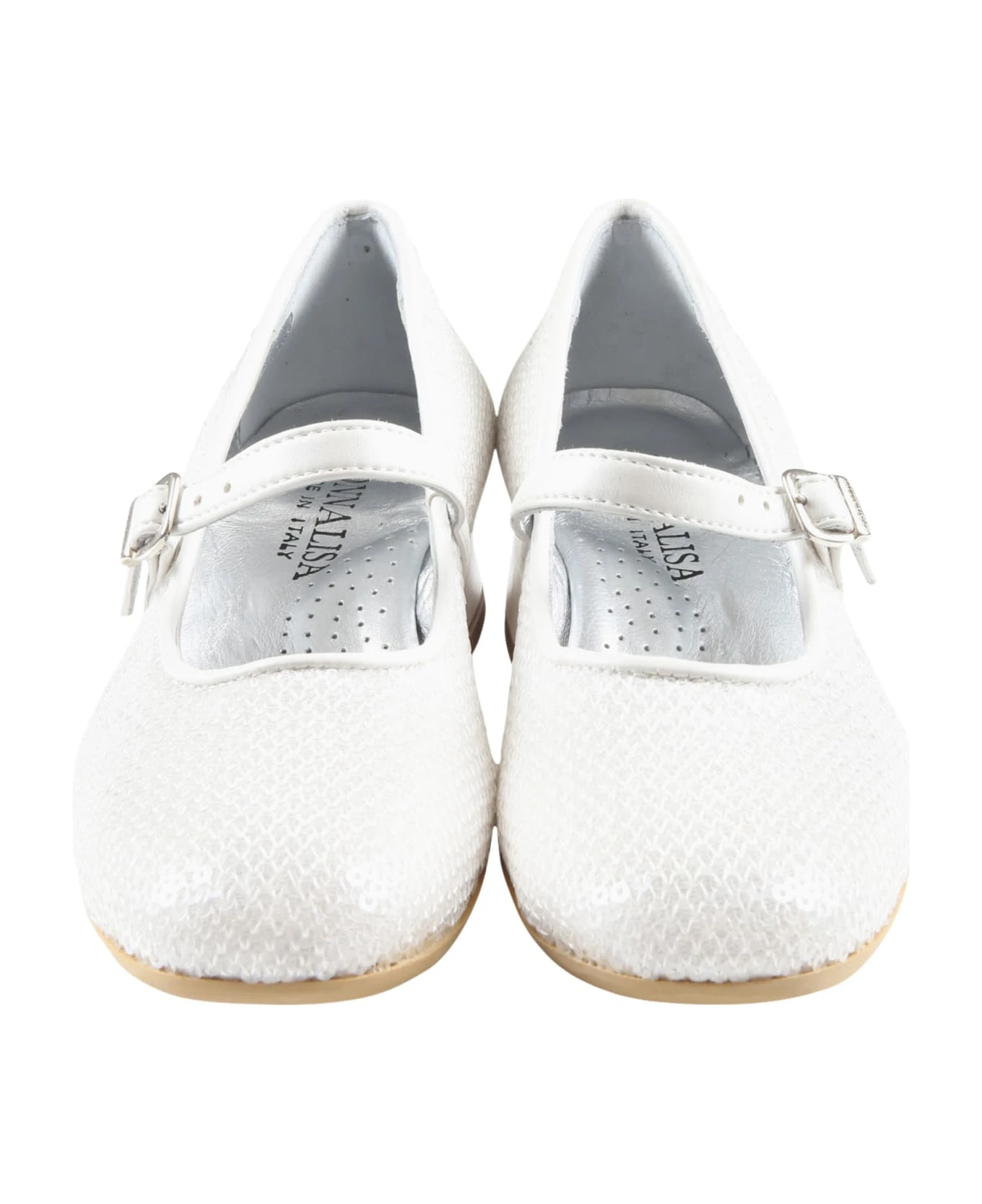 White flats with heel and adjustable closure on the top, are embellished with all-over sequins.