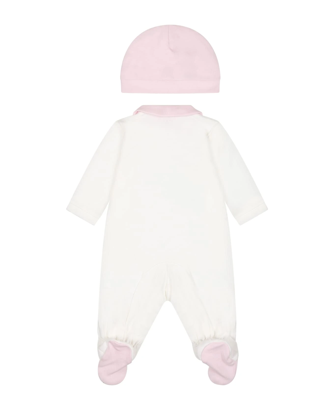 White cotton set composed of babygrow and hat; babygrow with long sleeves, peter pan collar, snap closure on the side and between the legs, feet. They are embellished with heart and logo on the front.