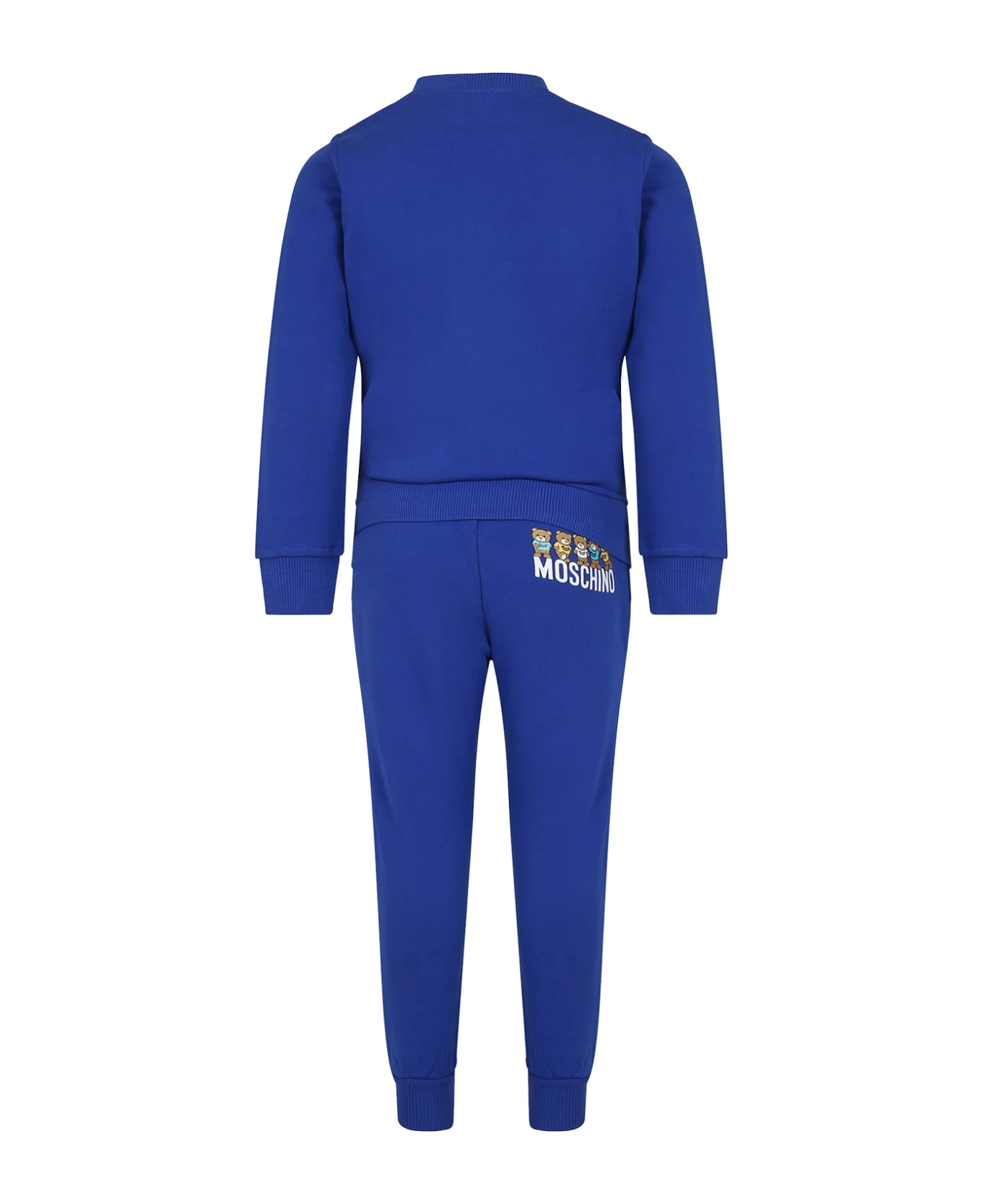 Blue brushed cotton suit, composed of sweatshirt and trousers. Long-sleeved sweatshirt with ribbed crew neck, cuffs and hem. trousers with elastic waist, elasticated ribbed ankles. They are embellished with multicolor Teddy Bears and logo on the front.