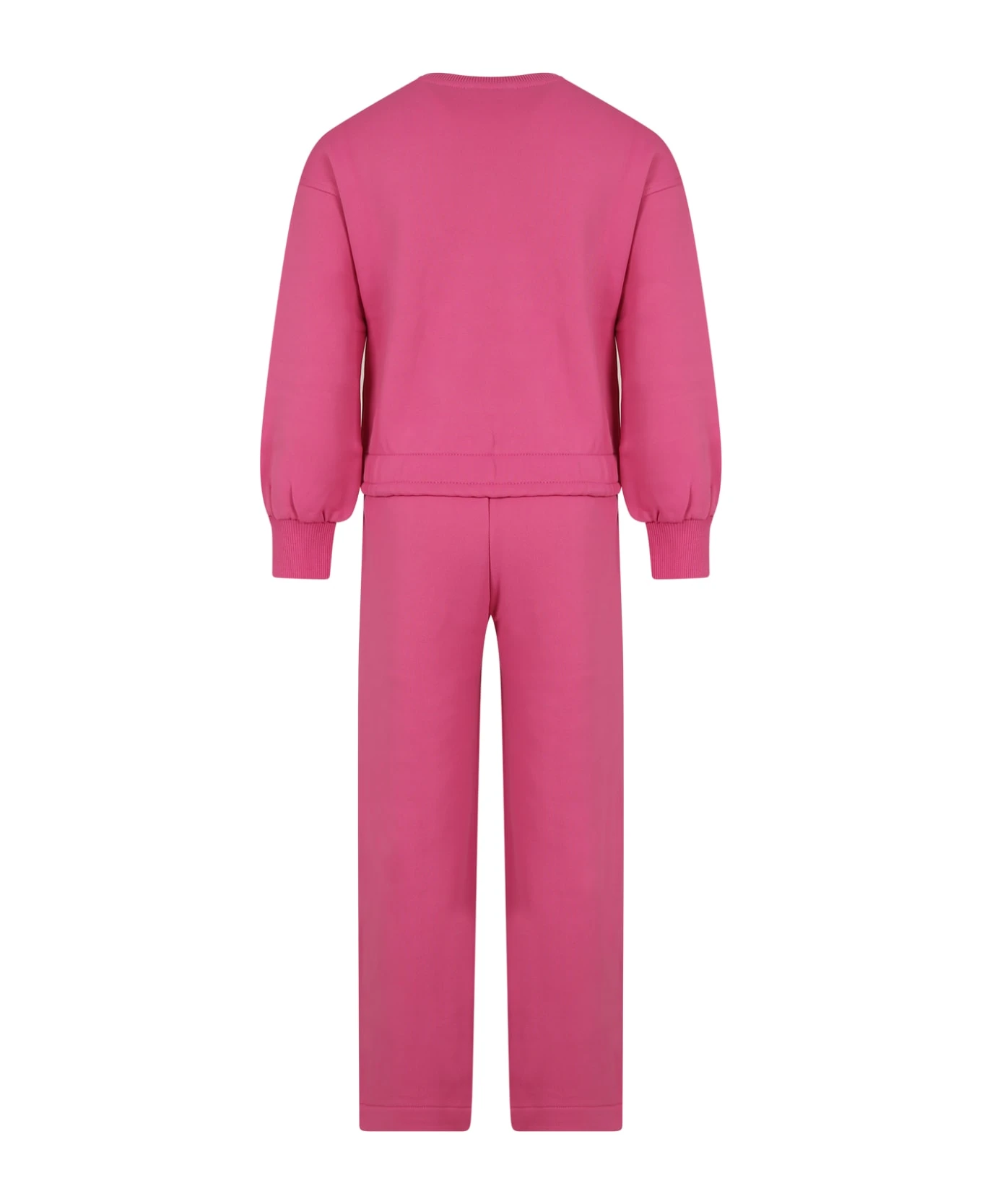 Fuchsia tracksuit in brushed cotton, composed of sweatshirt and trousers; sweatshirt with long sleeves, crew-neck and ostrich cuffs, elasticated hem; it is embellished with sequined sailor Teddy Bear and logo, on the front. Trousers with elasticated waist and side pockets. They are embellished with logo on the leg