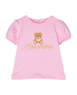 pink t-shirt baby girl. Jersey construction, teddy bear print, embroidered logo, crew neck, back button closure, short sleeves and straight hem. Cotton 94%, Elastane 6%