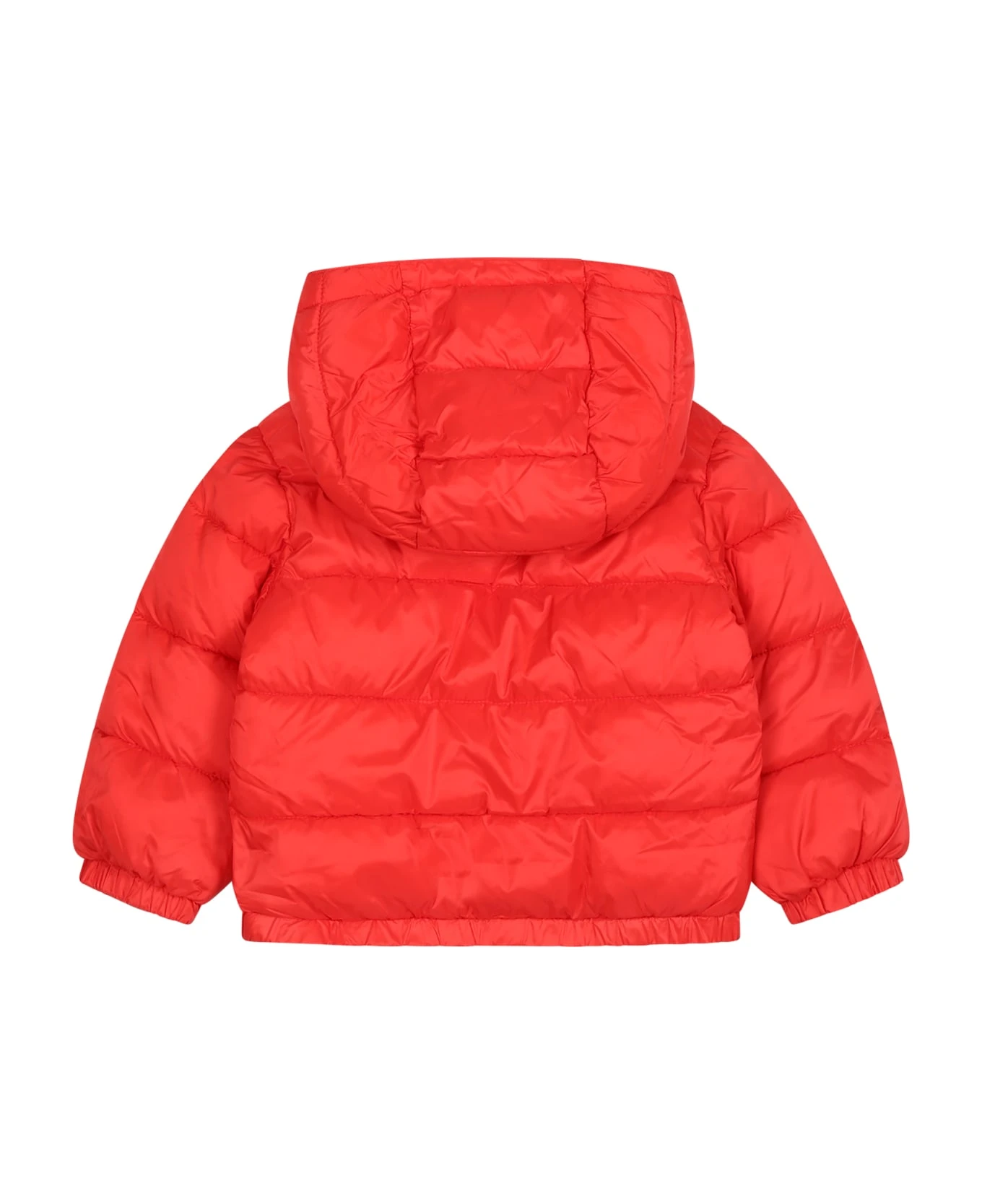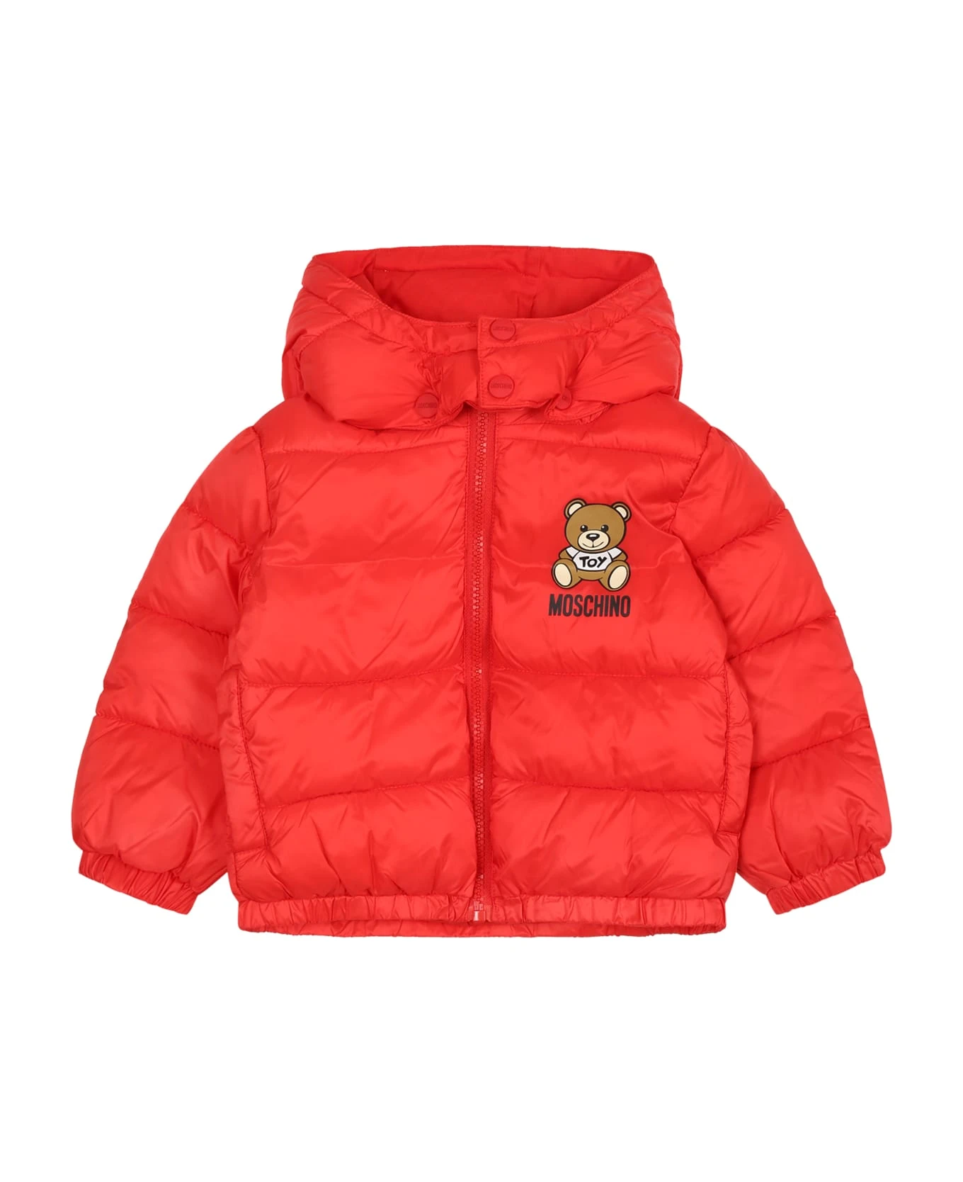 Red light down jacket, padded and quilted, with long sleeves, detachable hood, front zip closure, side pockets, elasticated cuffs and hem. It is embellished with Teddy Bear and logo on the chest.