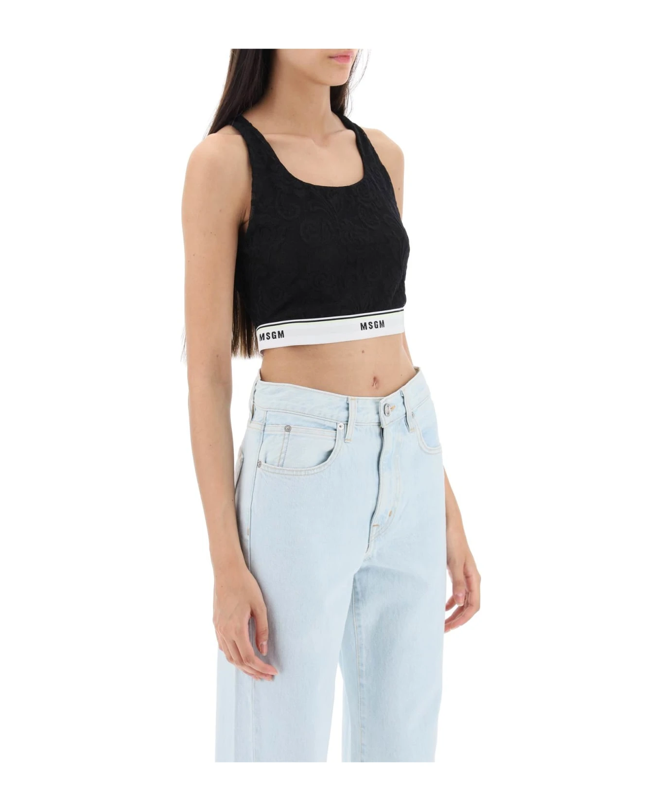 MSGM sports bra crafted in semi-sheer stretch lace with contrasting logoed elastic band. Design with round racer back neckline. Fitted. The model is 177 cm tall and wears size IT 38.