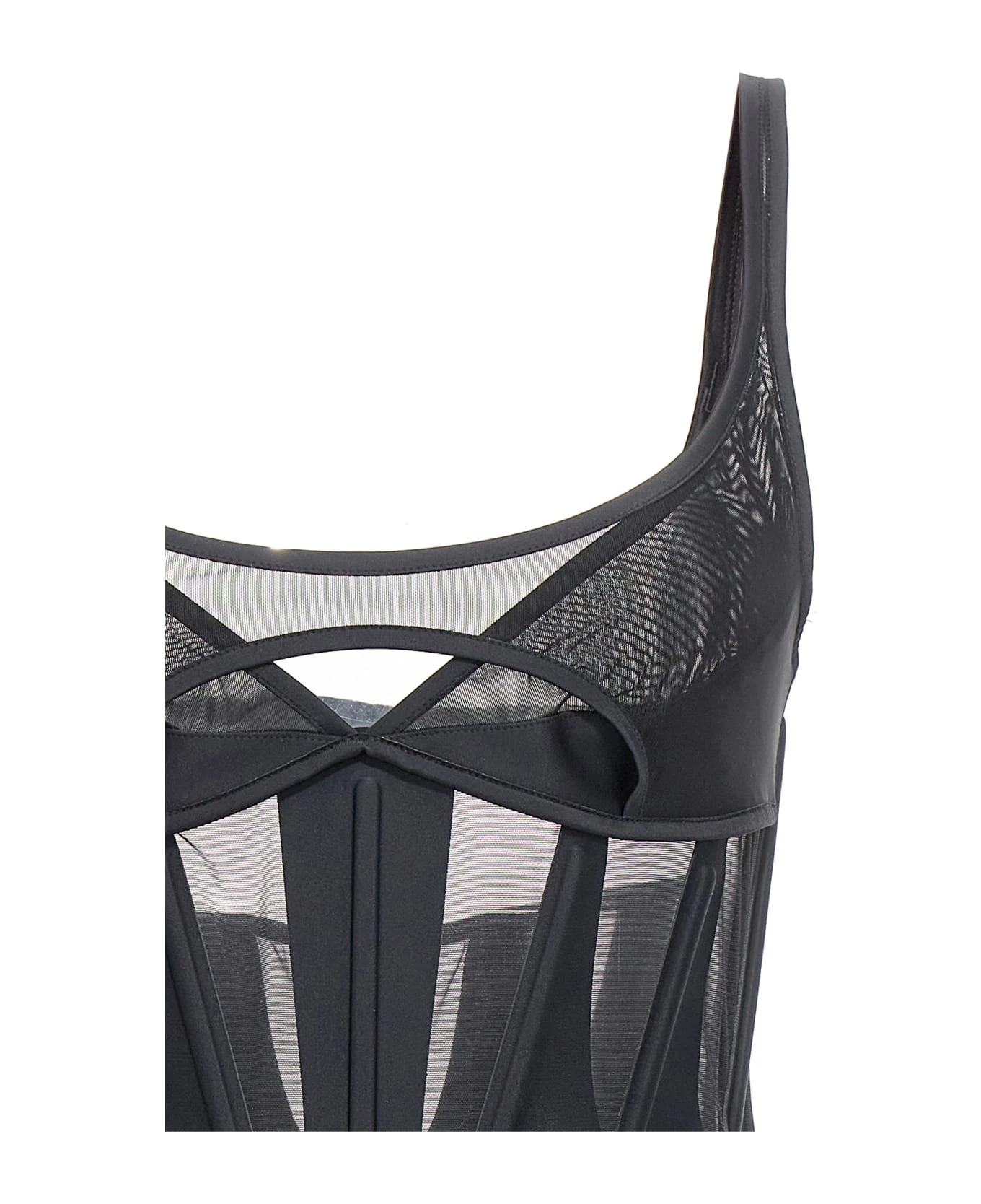 Stretch minidress with chest straps and mesh inserts.