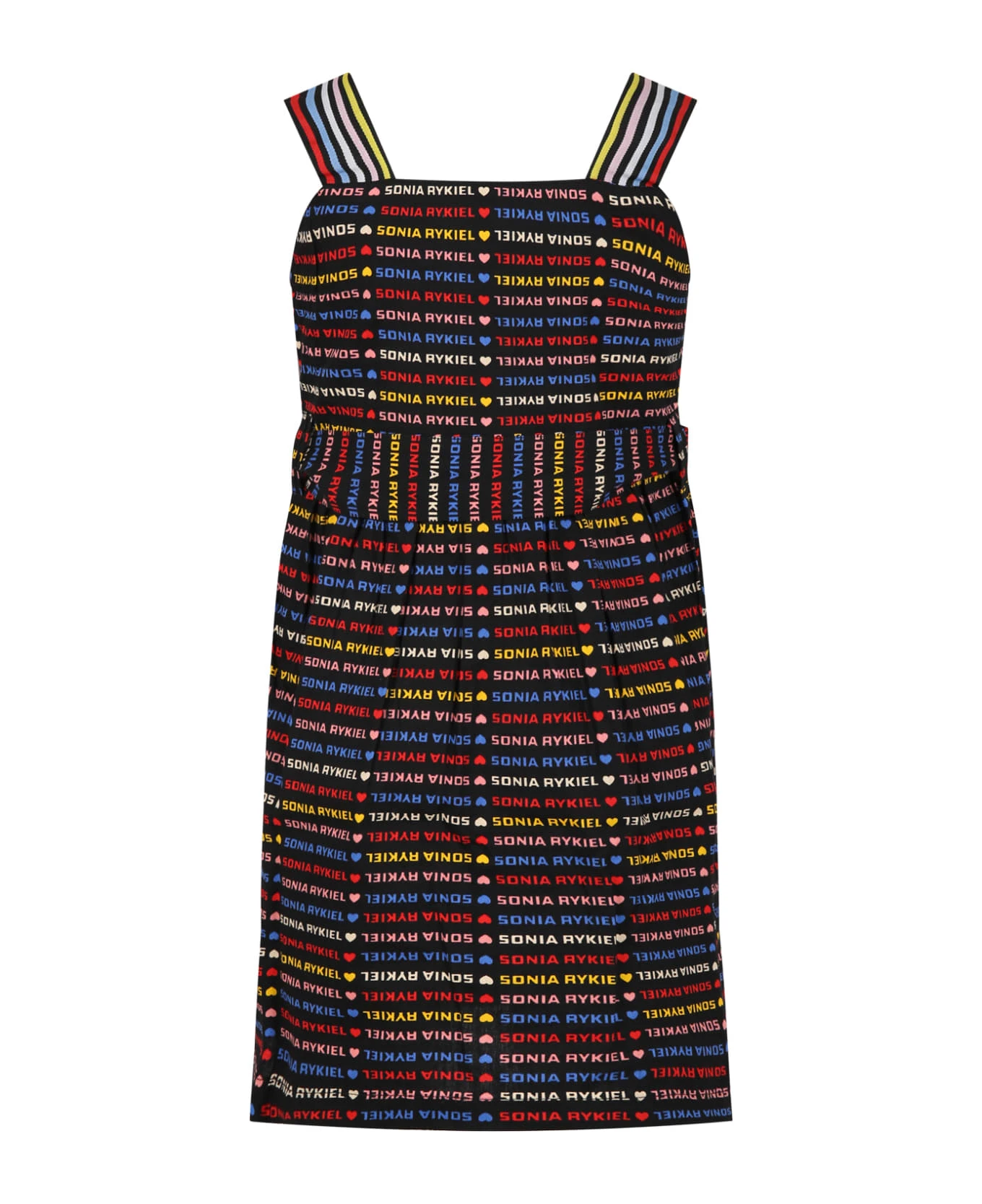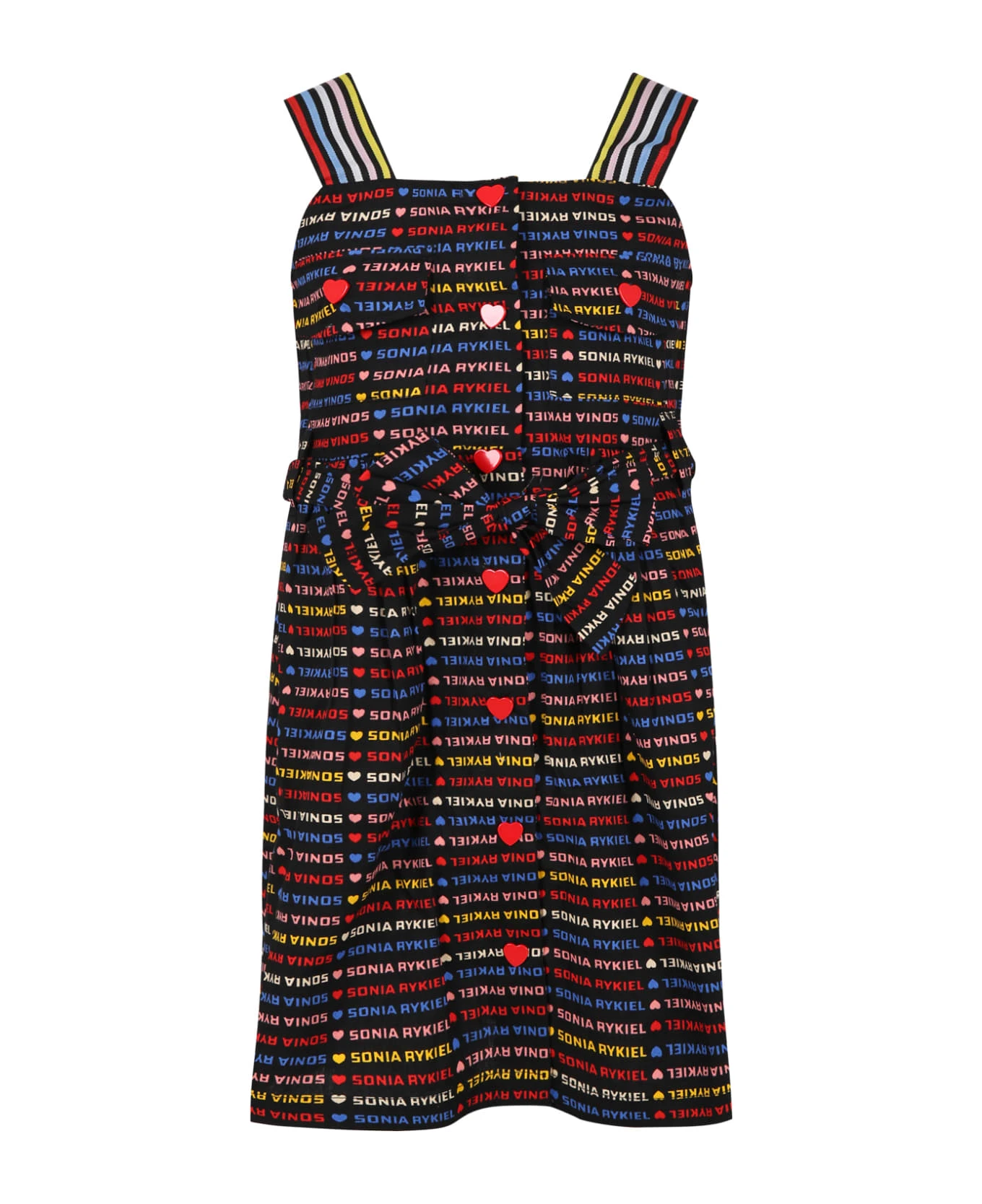 Black sleeveless dress, in cotton, with multicolor shoulder straps, belt loops, knot at the waist, closure with heart-shaped snap buttons, chest pockets with heart-shaped buttons. He is embellished with multicolor hearts and logo all-over.