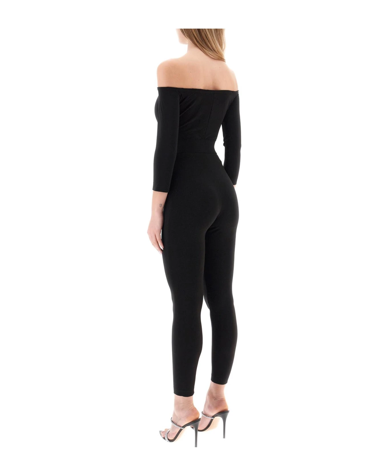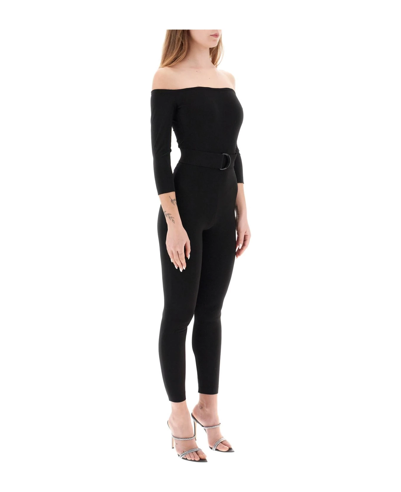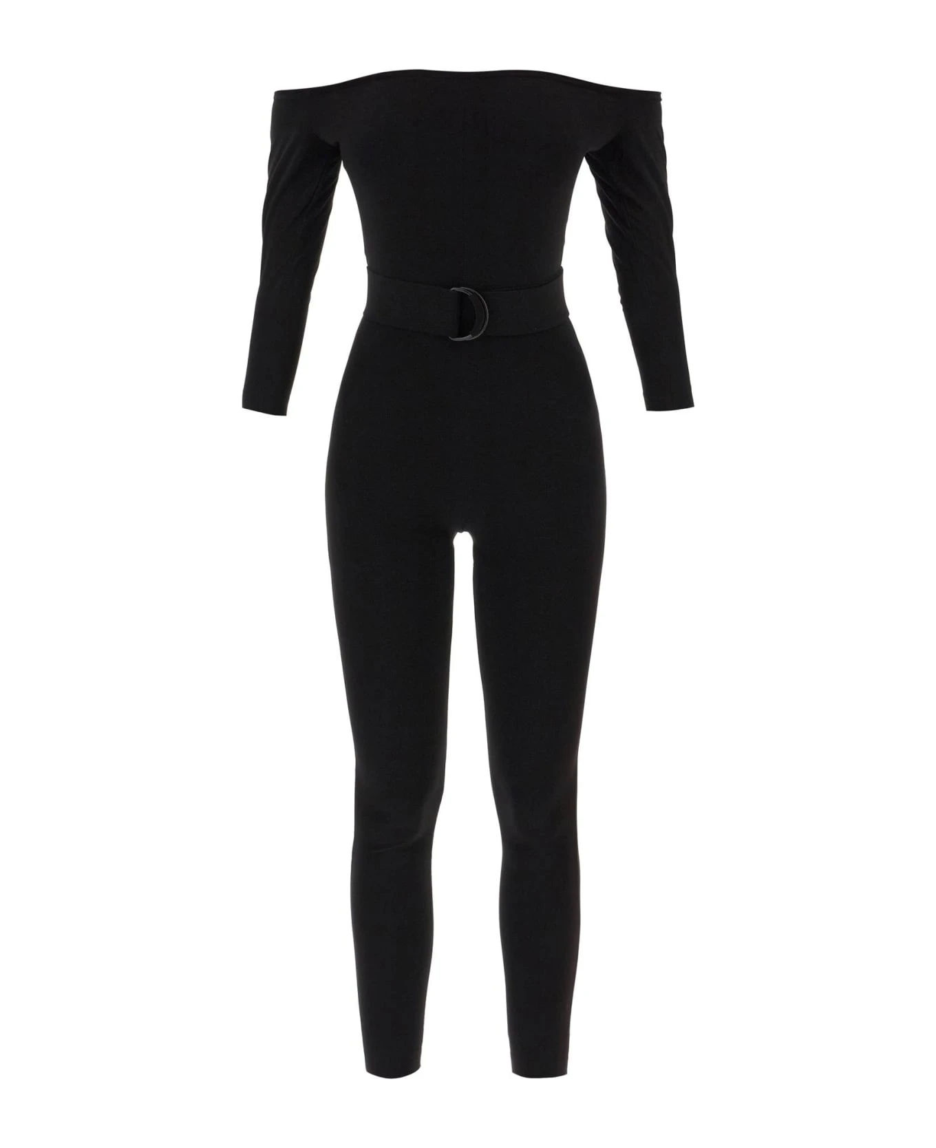 Norma Kamali strapless catsuit made of stretch Poly Lycra with three-quarter sleeves. Provided with additional D-Ring belt. Ankle lenght, slim fit. The model is 177 cm tall and wears a size XS.