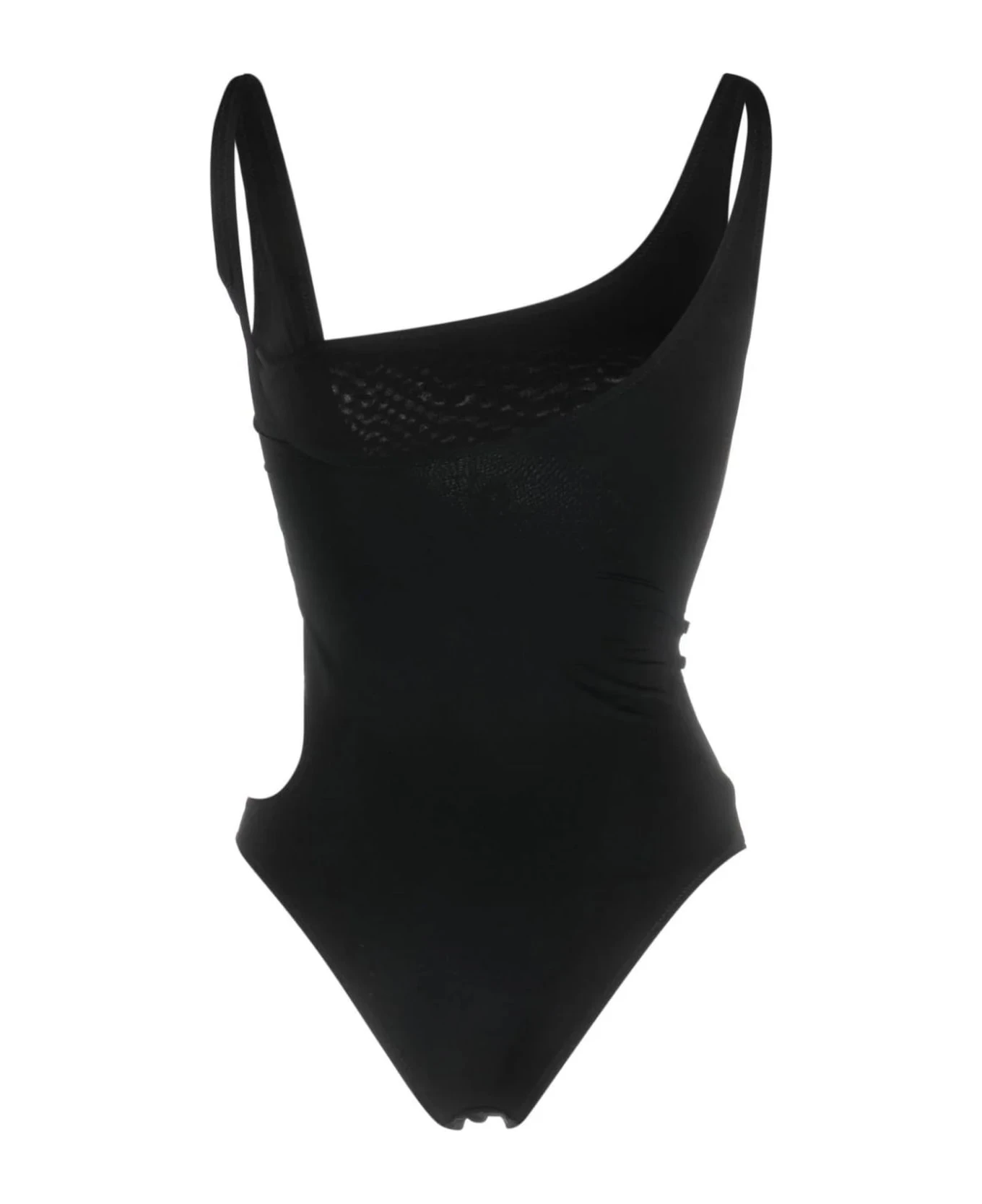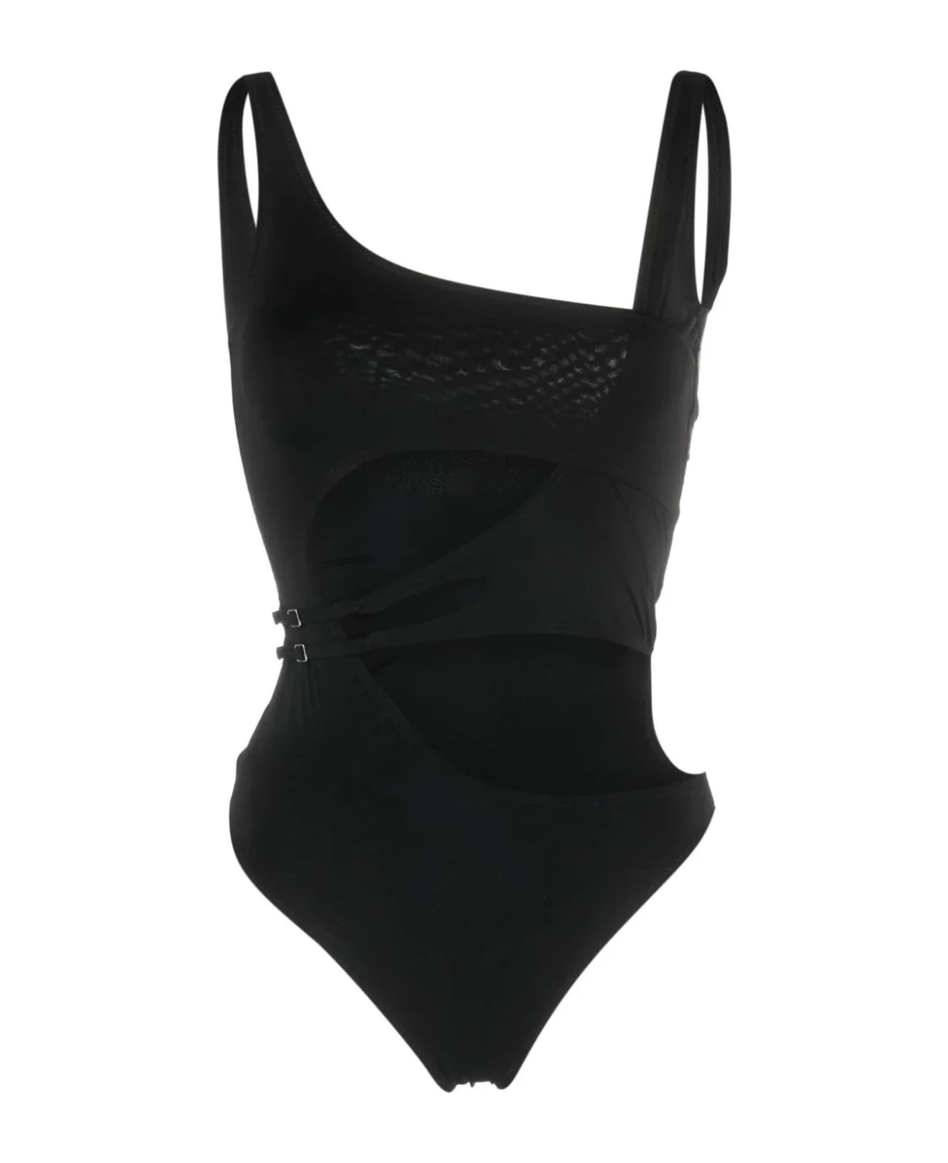 Black cut-out high-cut swimsuit, stretch-design, double buckle fastening, asymmetric neck, thin shoulder straps, high cut. Be mindful to try on swimwear over your own garments.
