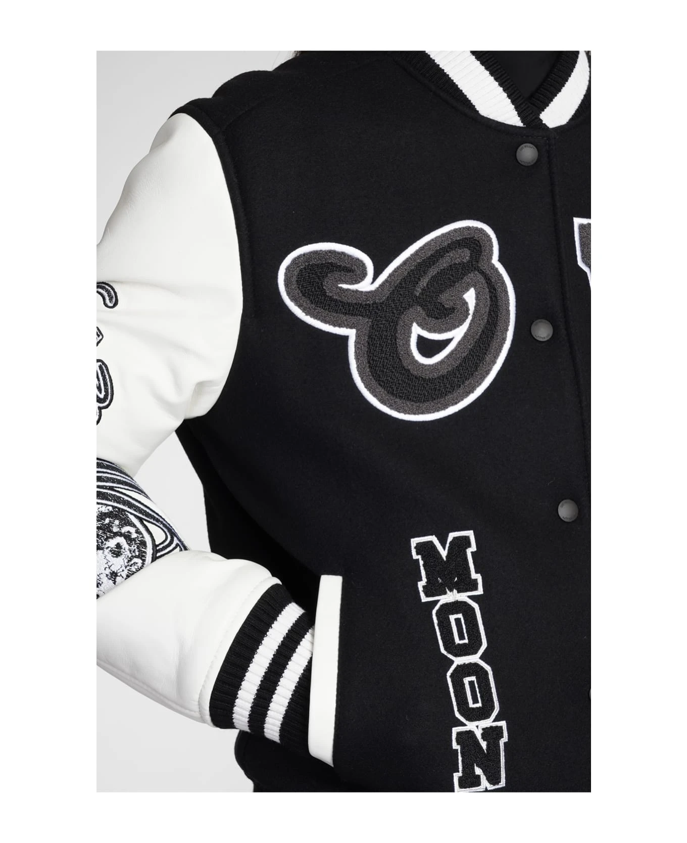 Casual jacket in white leather, bomber collar, frontal buttoning, automatic buttons, pockets, ribbed cuffs and bottom, logo patch on chest, patch logo sleeves, mesh sleeves, embroidered logo back, 75% wool, 25% polyamide, 100% leather, Made in Romania, model is 180 cm and wears size 40