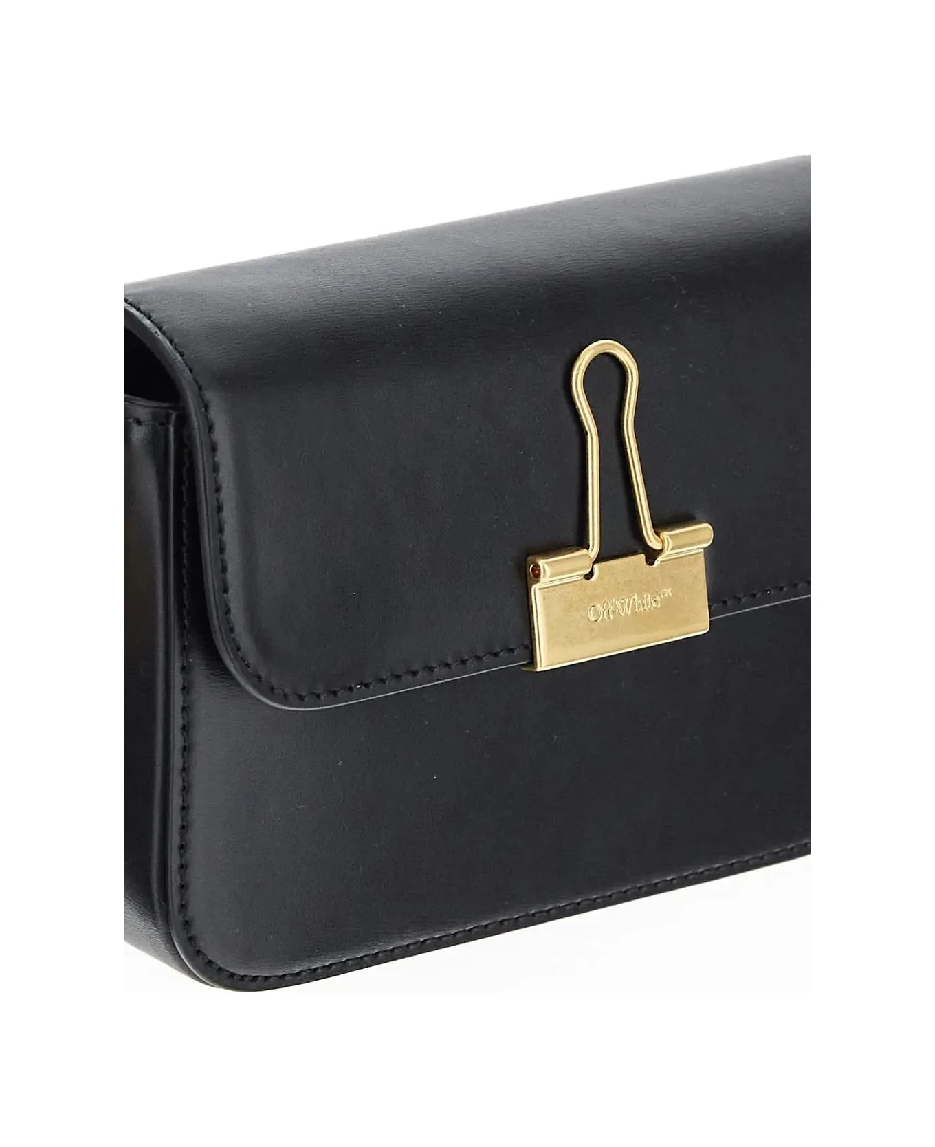 Off-White shoulder bag in black leather with aged gold finish foldover paperclip branded detail, magnetic flap closure, rounded bottom, detachable/adjustable grosgrain shoulder strap, a back flat pocket with logo print and inner compartment with a zipped pocket.