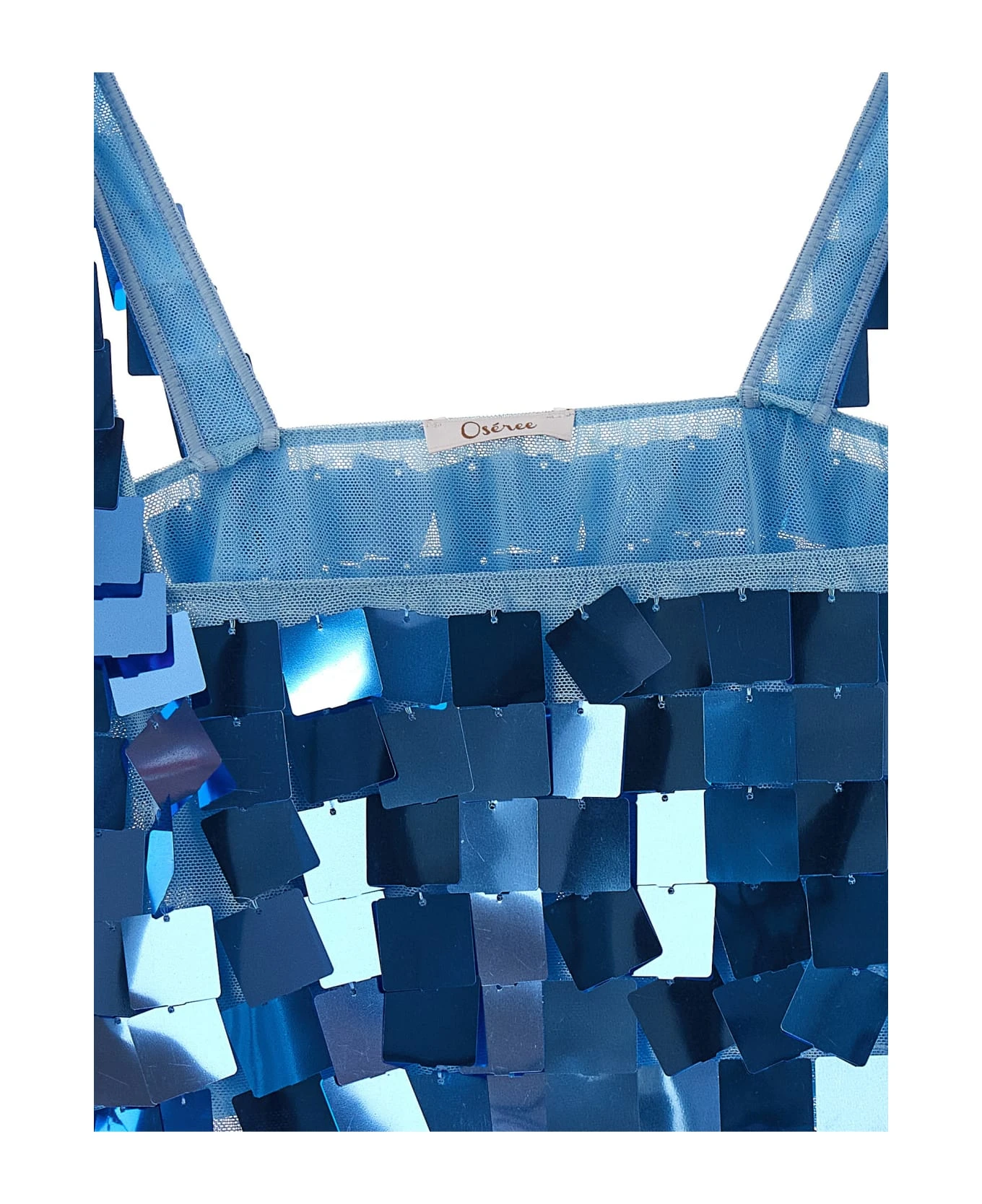 ‘Disco Sequins Square’ mesh fabric top with maxi sequins.