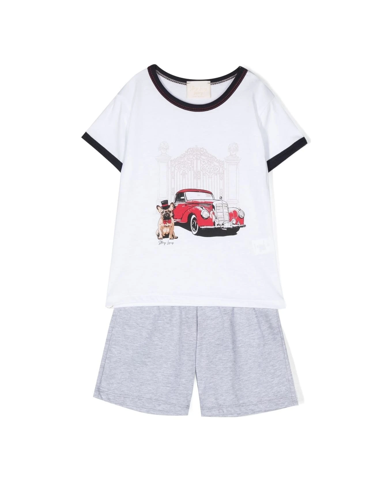 White, ash grey, cotton, contrast trim, round neckline, short sleeves, straight hem, mélange effect and elasticated waist.