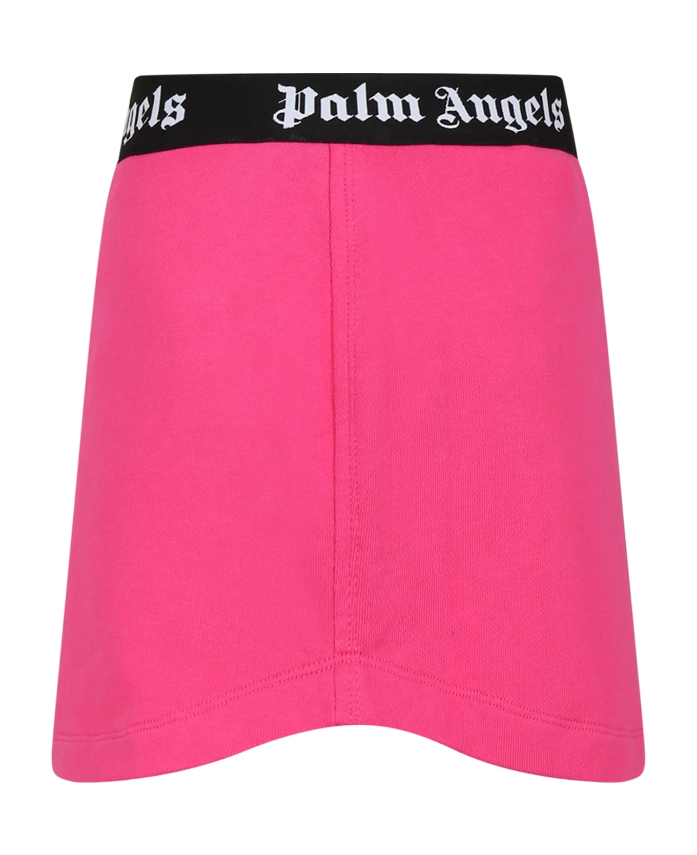 Fuchsia skirt in brushed cotton, with black elastic waistband. It is embellished with white all-over logos on the elastic.