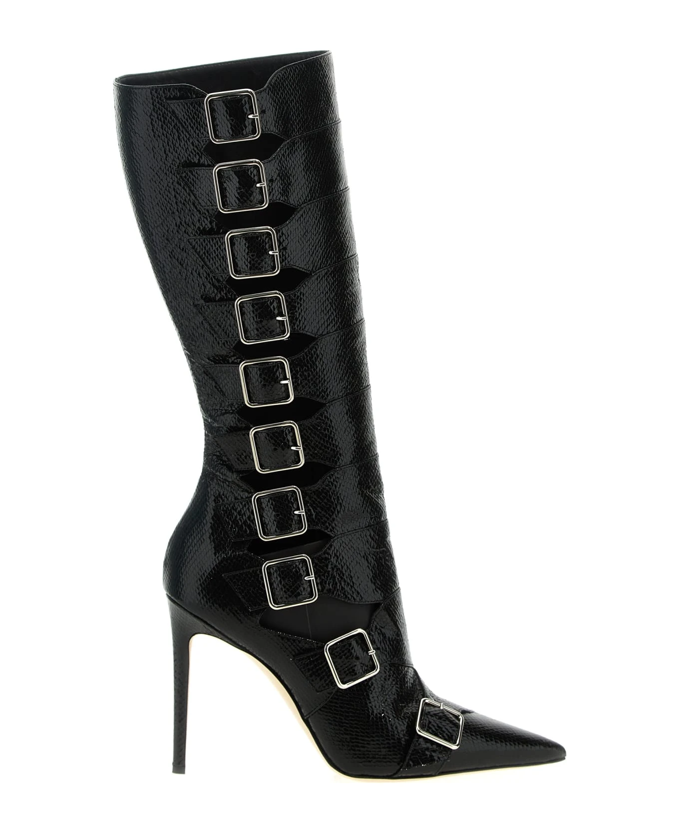 ‘Tyra’ metallic leather boots with viper print, stiletto heels.