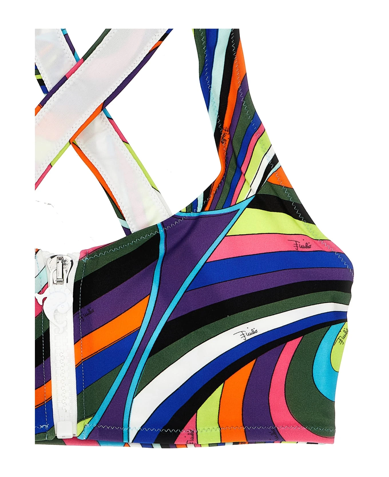 Stretch fabric bikini top with patterned print, crossed shoulder straps at the back and a front zip closure. This product, as well as many other Pucci items, is made with an allover print that falls differently on each garment the product shipped may differ from the one in the photo.