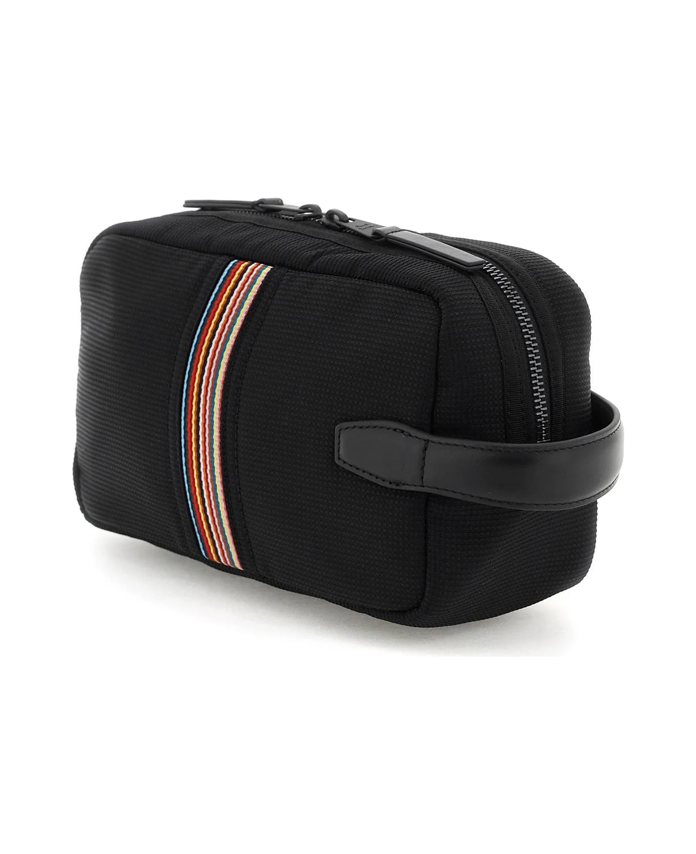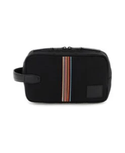 Paul Smith nylon beauty case featuring multicolored striped trim and embossed logo patch at front. It features two-way zipper closure, lined interior, one open pocket and two additional mesh open pockets, leather side handle.