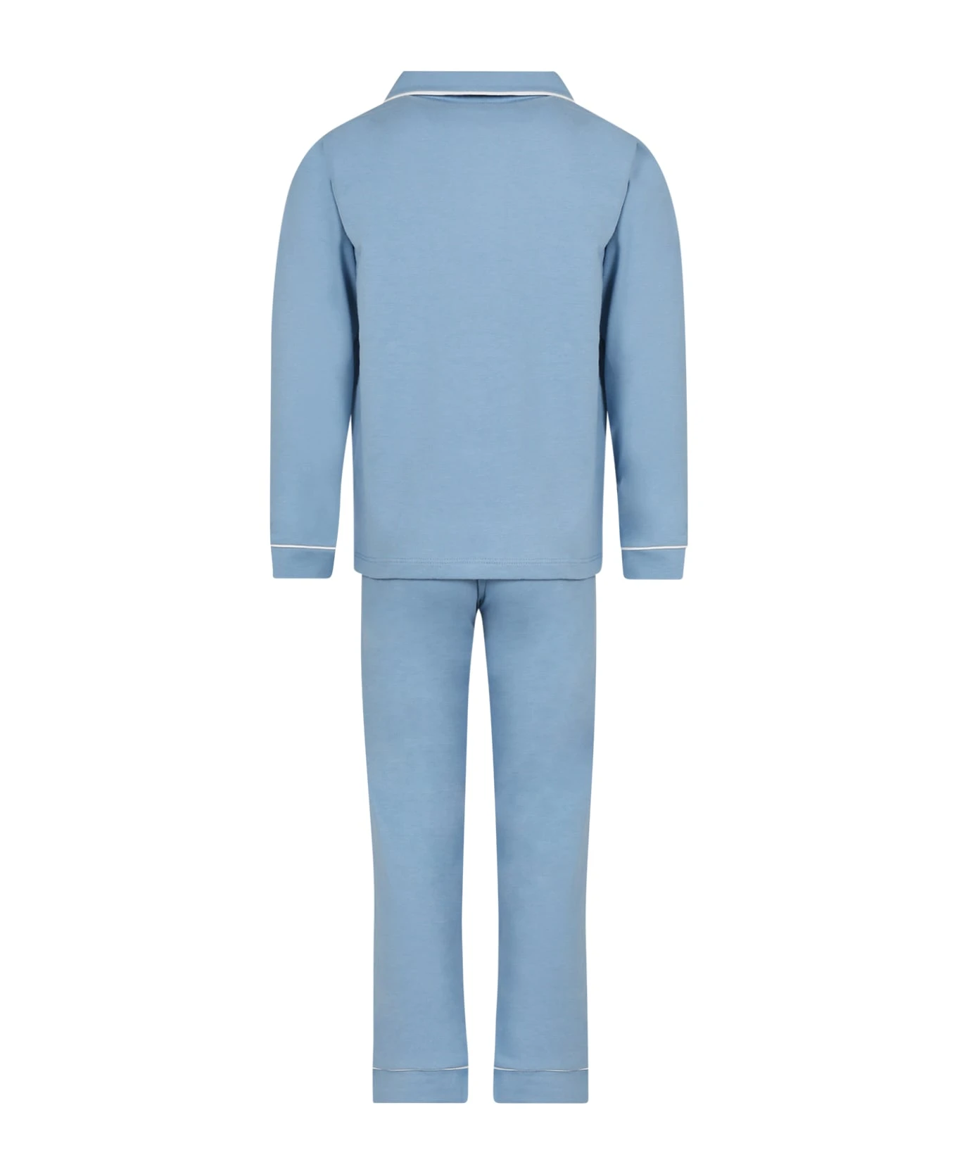 Light blue pajamas made of organic cotton, composed of t-shirt and trousers; t-shirt with long sleeves, pointed collar, front closure with buttons, patch pocket on the chest; trousers with elastic waist. They are embellished with logo and white details.