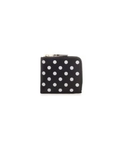Comme Des Garçons black and white leather polka dot wallet featuring gold-tone zip closure, embossed logo on the front and internal pockets.