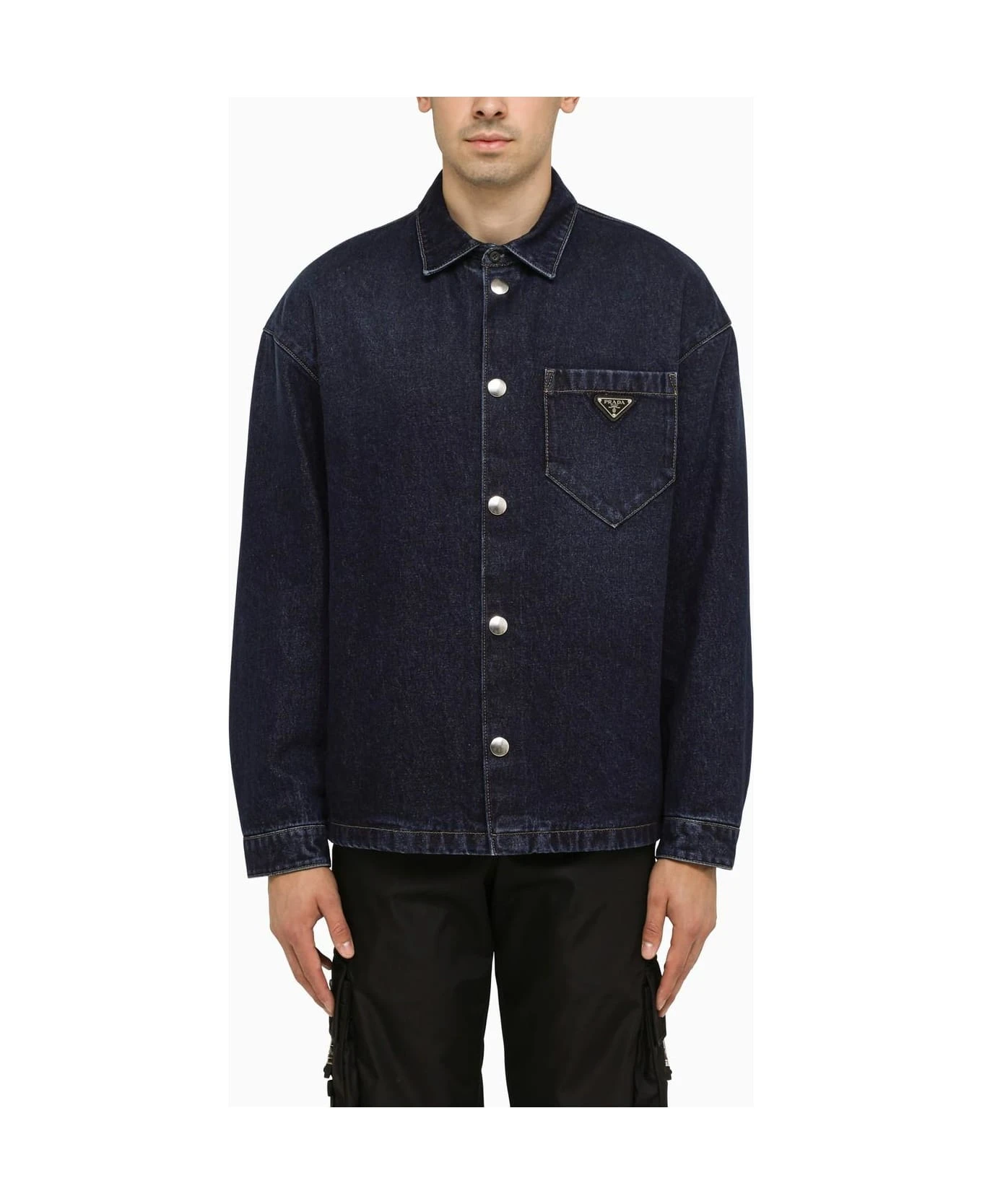 Blue cotton denim jacket/shirt from Prada featuring a front snap fastening, a chest pocket, an enamelled leather logo plaque detail on the front and long sleeves.
