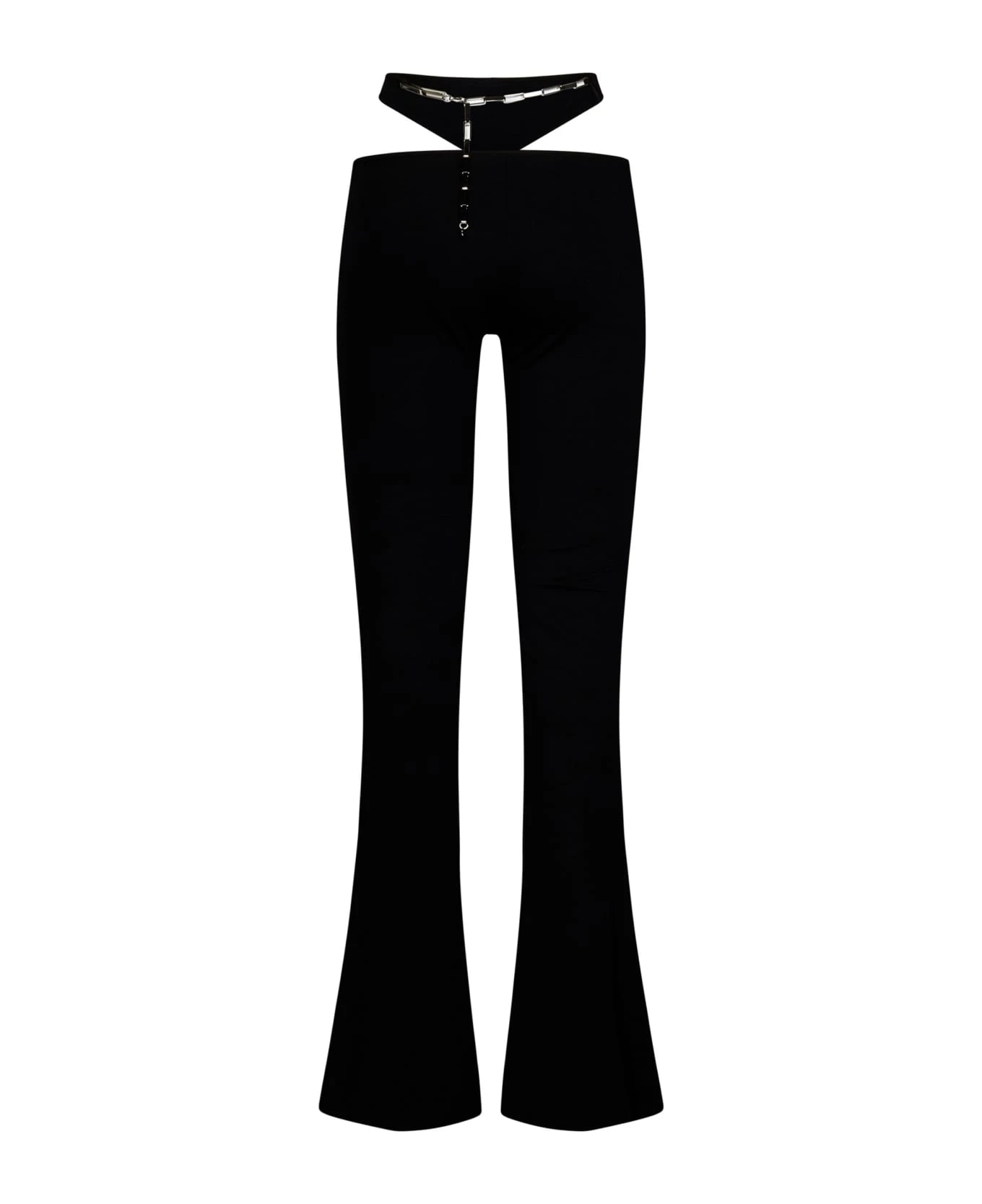 - High waist, cut-out details at hips; Silver metal adjustable chain and logo plate at back