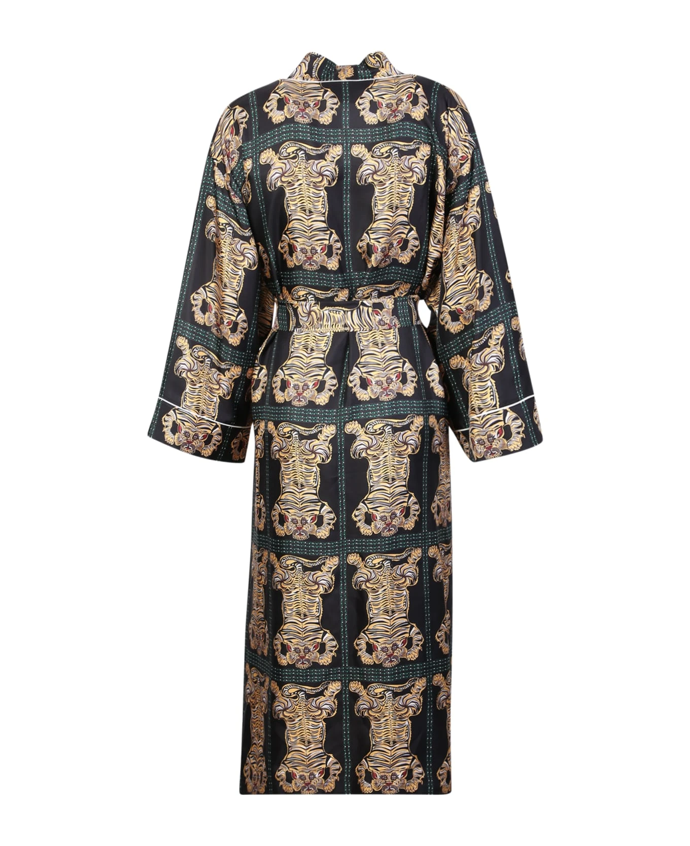 Shawl lapels. Long sleeves. Tiger print. Tied waist. Color: brown