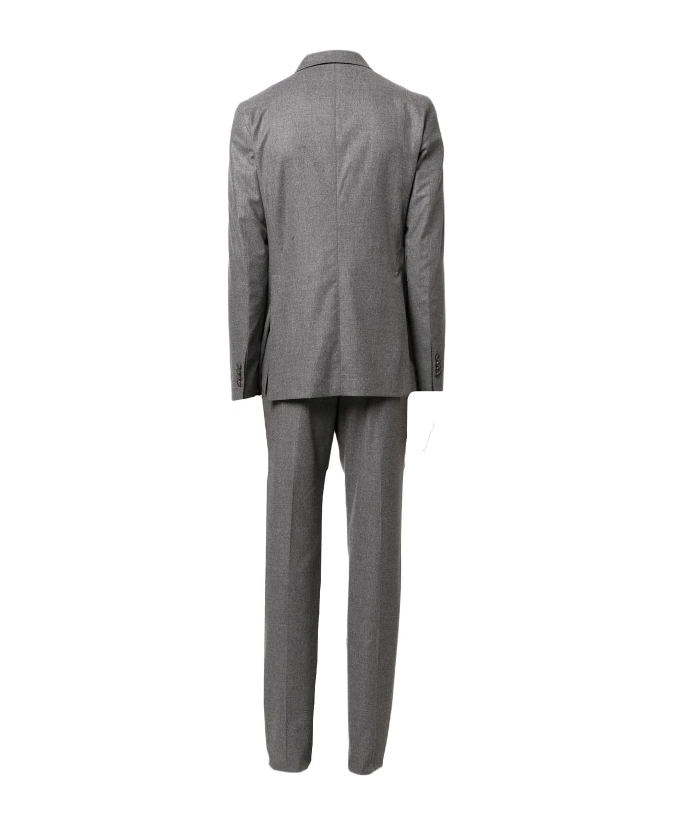 Single-breasted virgin wool blend suit, grey, brooch detail, peak lapels, front button fastening, chest welt pocket, two front patch pockets, long sleeves, buttoned cuffs, English rear vents, straight hem, mid-rise, pleat detailing, belt loops, off-centre front button fastening, two side slash pockets, two rear button-fastening jetted pockets, straight leg, tailored cut