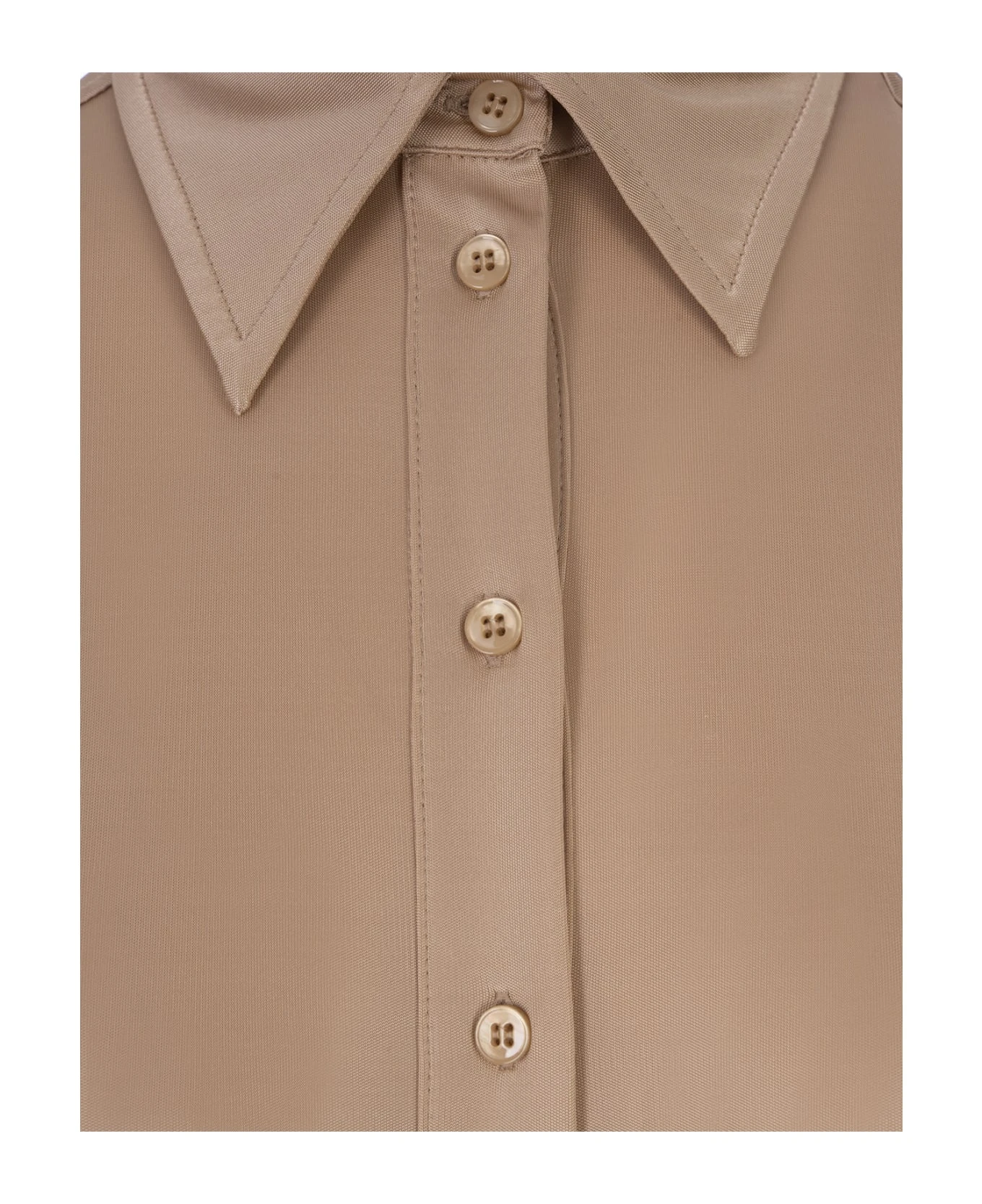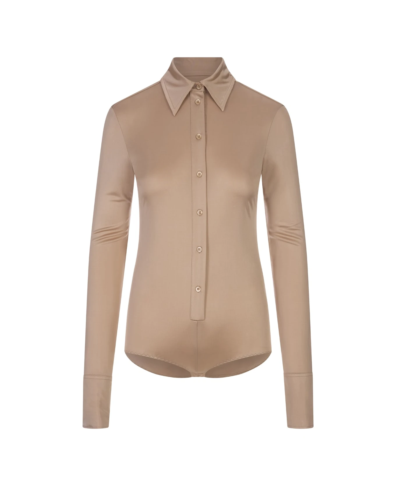 Body in shirt construction, Pera model by Sportmax made of beige shiny viscose jersey. Cuffs and neckline are inspired by male models, while the fit remains close-fitting. Back yoke construction and cut out back