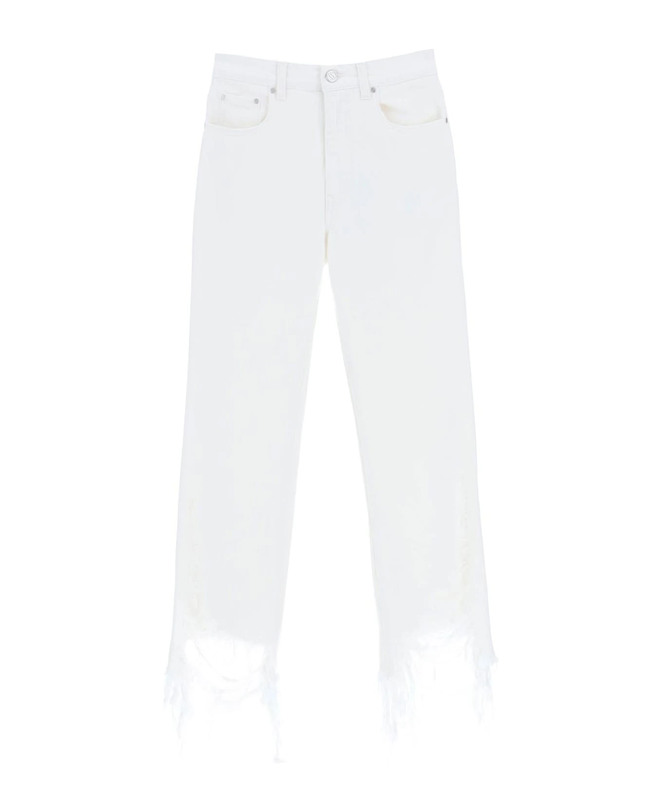 Five-pocket jeans by Stella McCartney crafted in organic cotton denim featuring a flared leg and a cropped destroyed hem. Concealed zipper fly, faux leather patch with embossed logo at back. The model is 177 cm tall and wears a size 26.