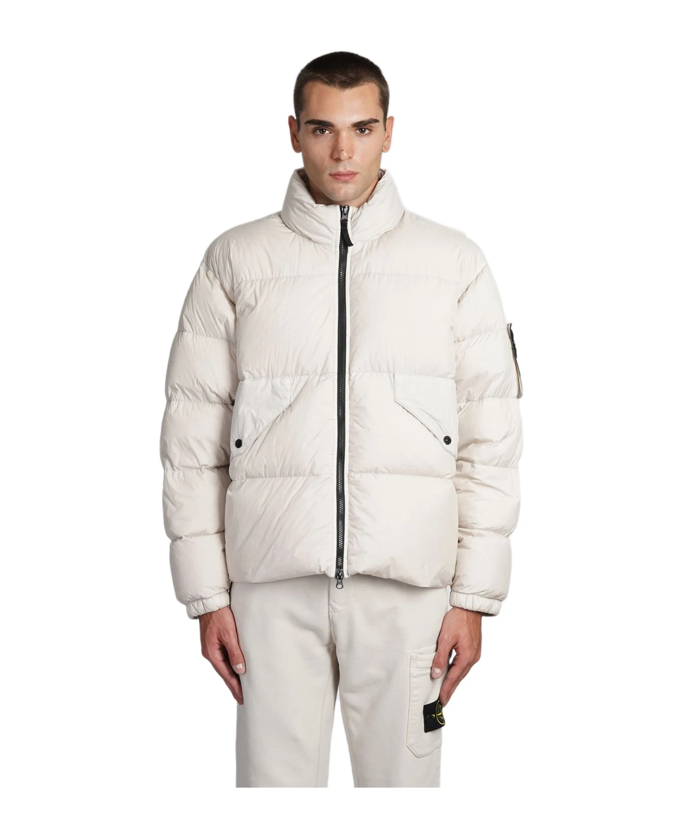 puffer in beige polyamide, high collar, zip closure, button pocket, patch logo sleeves, quilted design, elastic cuffs, 100% polyamide, Made in Indonesia, Model is 187 cm and wears size L