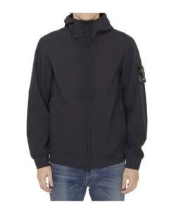Soft Shell jacket in black nylon with Compass patch on left sleeve. It features drawstring hood, front zip closure and two side zip pockets. Regular fit.
