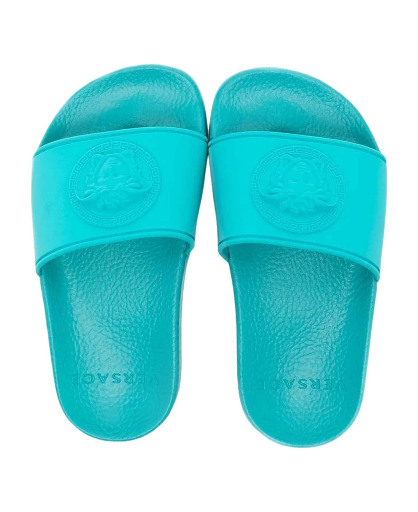 Turquoise slippers unisex Kids. Medusa Head motif, open toe, thick rubber sole and slip-on style. Rubber 100%