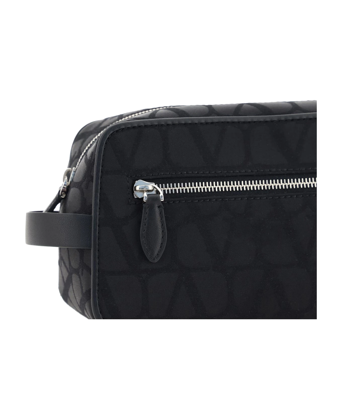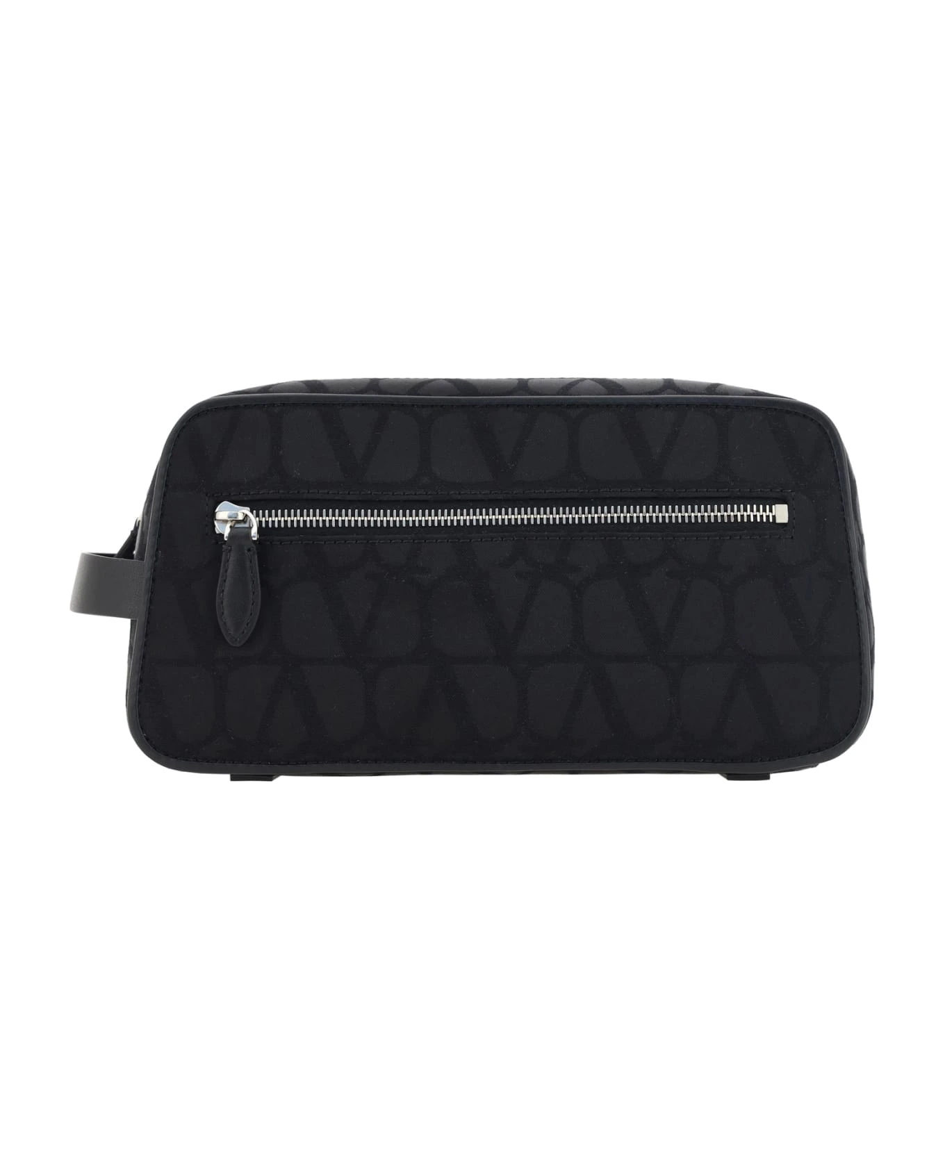 Beauty case by valentino garavani, leather pull on side panel, iconic all-over repeated brand vlogo, top zipper closure, front welt pocket. toile iconographe collection.