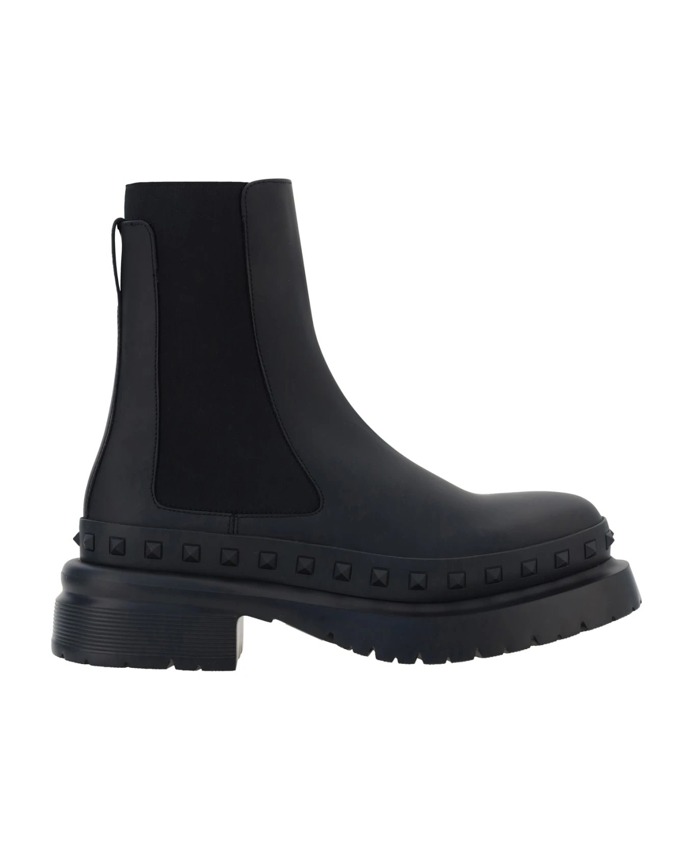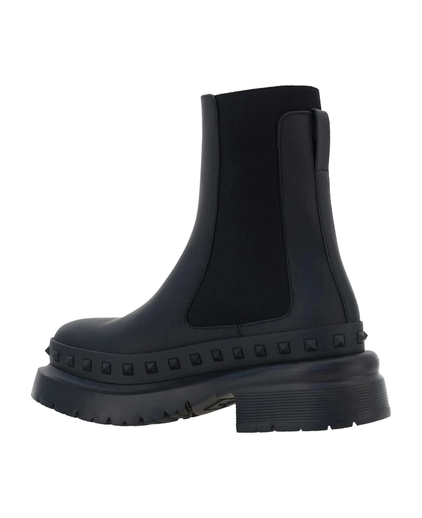 Rockstud beatle ankle boots by valentino garavani, round toe, ankle model, elastic side bands to facilitate the fit, structured leather sole, block heel, pull back, iconic rockstud brand studs applied all-over on the base.