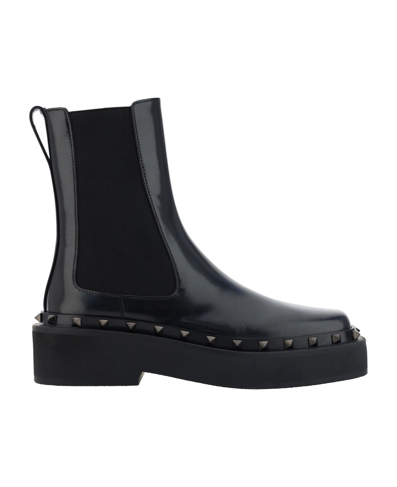 Rockstud m-way ankle boots by valentino garavani, elasticized bands on side panels, leather pullback for fit support, round toe, block heel, iconic brand studs applied to all-over sole profile, patent leather design.