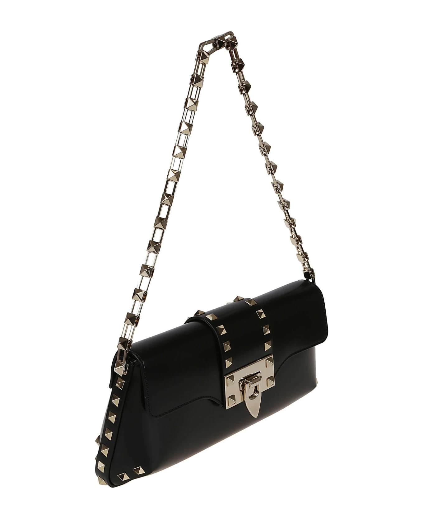 Brushed calfskin bag BY VALENTINO GARAVANI. Leather lining. Interior: flat pocket; iconic hook closure. The bag can be worn both by hand and on the shoulder. Profile and details decorated with studs and functional chain element characterized by the iconic platinum-colored studs.