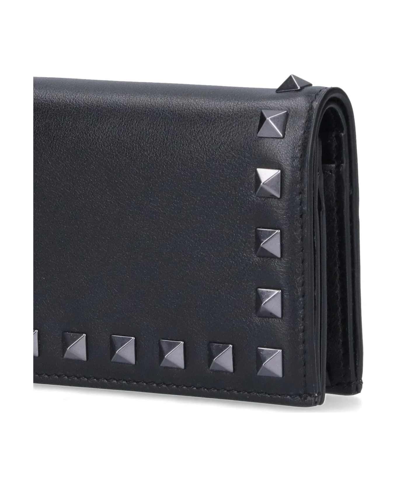 Valentino Garavani small ‘Rockstud’ wallet in black leather with snap button closure, metal stud finish detail, five internal card slots, an internal zip coin pocket, a bill pocket.