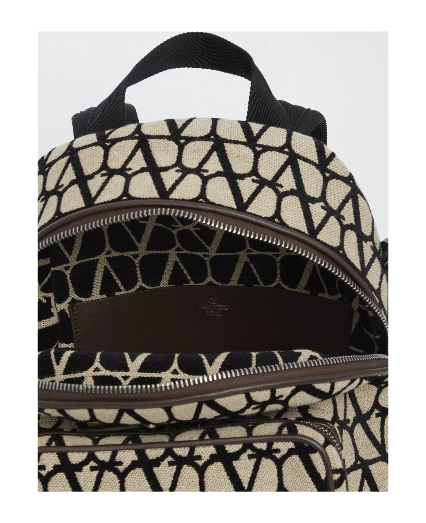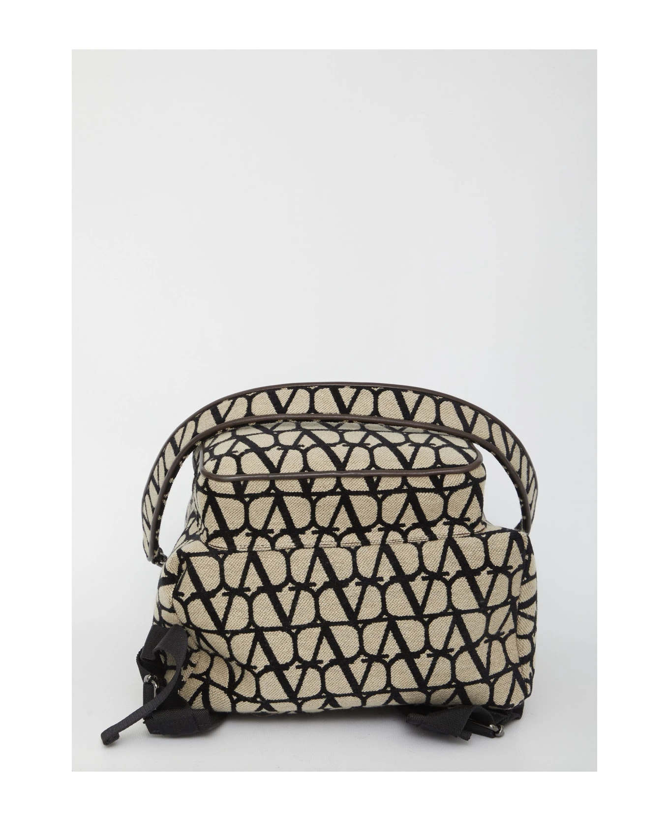 Valentino Garavani Toile Iconographe backpack in Toile Iconographe with leather details. It features fixed top handle, detachable shoulder strap, adjustable shoulder straps, one front zip pocket, zip closure, one main interior compartment and one interior slip pocket.