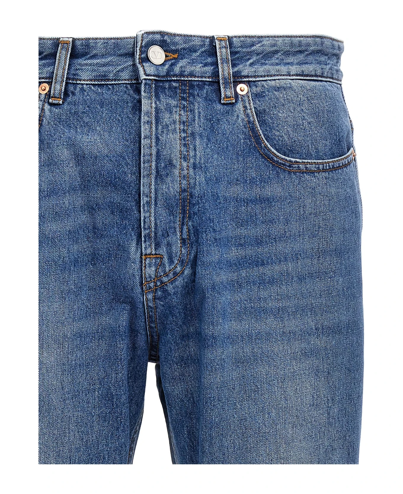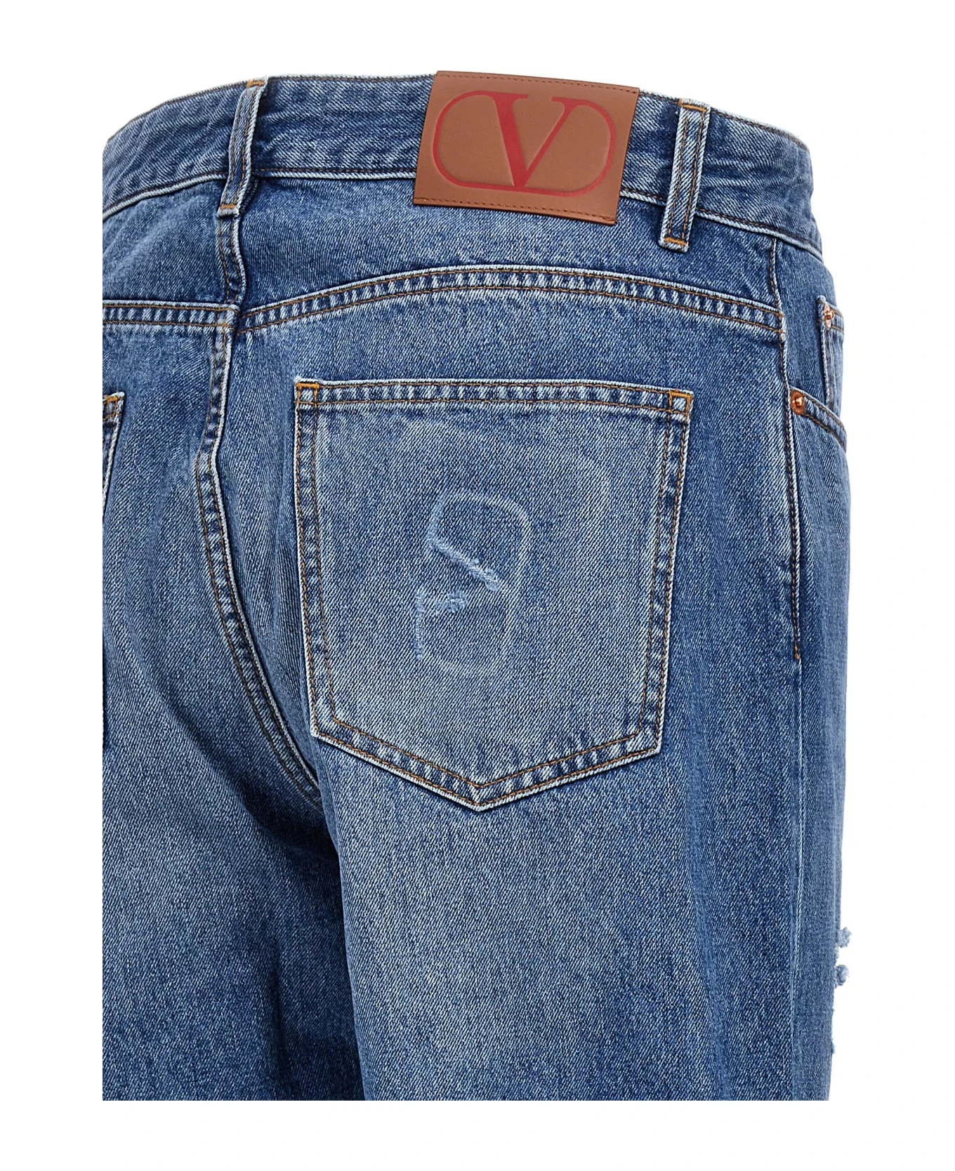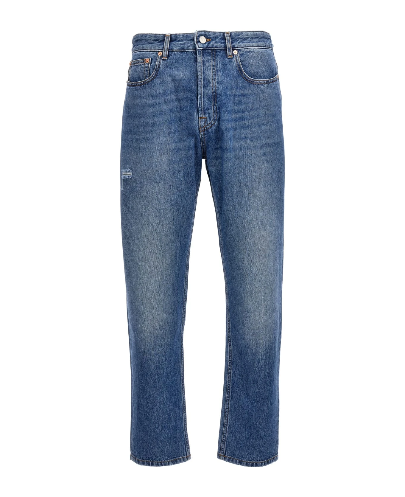 Straight fit denim jeans with zip and button closure, medium blue wash and a small rip detail.