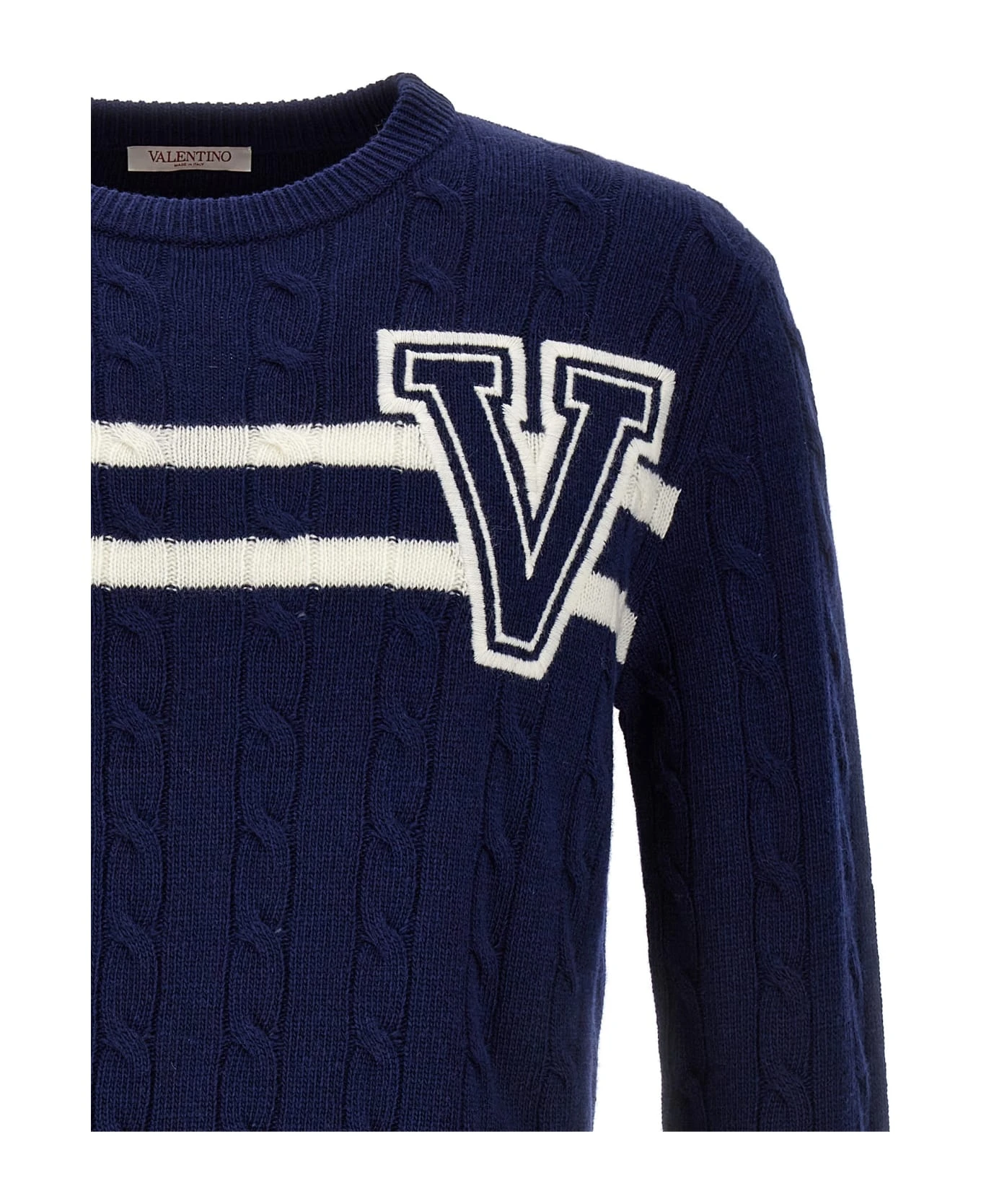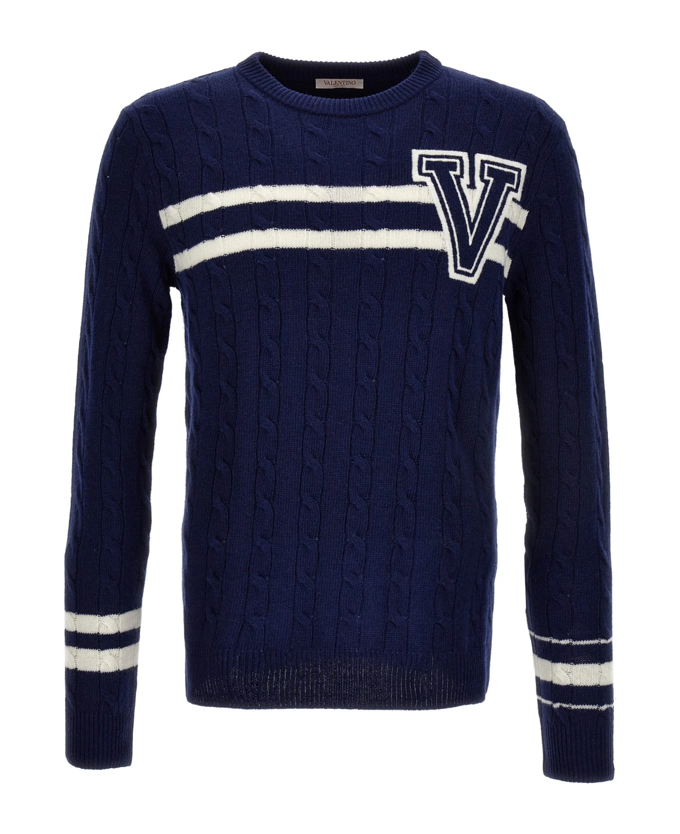 Wool sweater with front ‘VLogo’ patch, contrast striped detail, crewneck, and long cuffed sleeves.