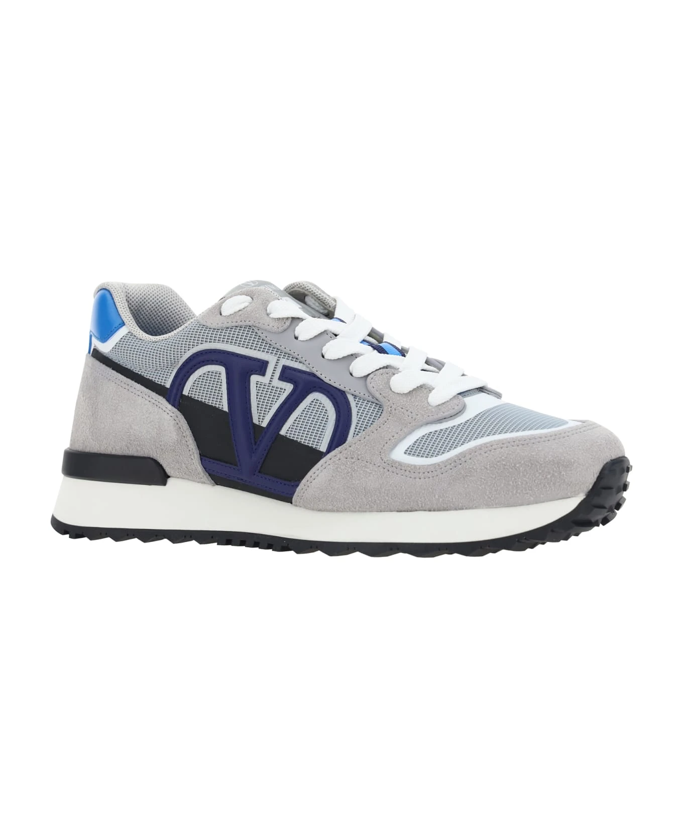 Vlogo sneakers by valentino garavani, round toe, contrasting textured and textured knurled sole, front lace-up closure, contrasting embroidered logo label on front tongue, paneled design with mesh inserts and perforated details, iconic brand vlogo in contrasting pattern on outer side panel.