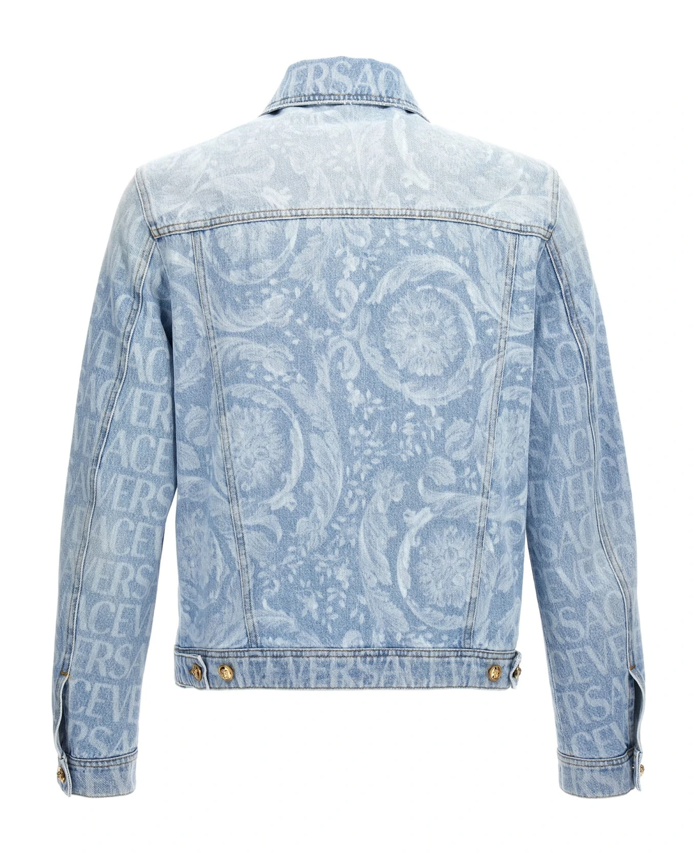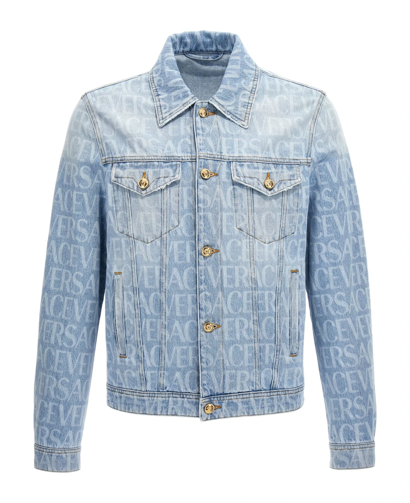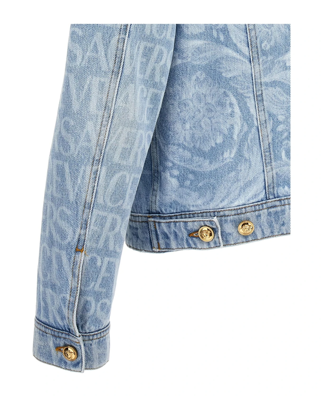 Cotton denim jacket with ‘Versace Allover’ logo pattern, Medusa button closure, pockets, and long cuffed sleeves.