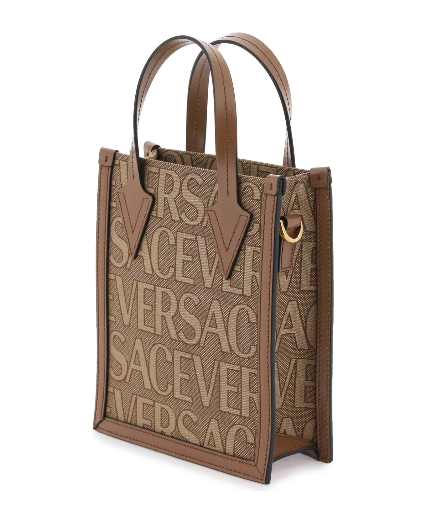 Versace small tote bag made of jacquard canvas and characterized by Versace Allover pattern. It features leather details, twill lining, interior open pocket, double top handles, adjustable and removable shoulder strap. Gold-tone metalware.