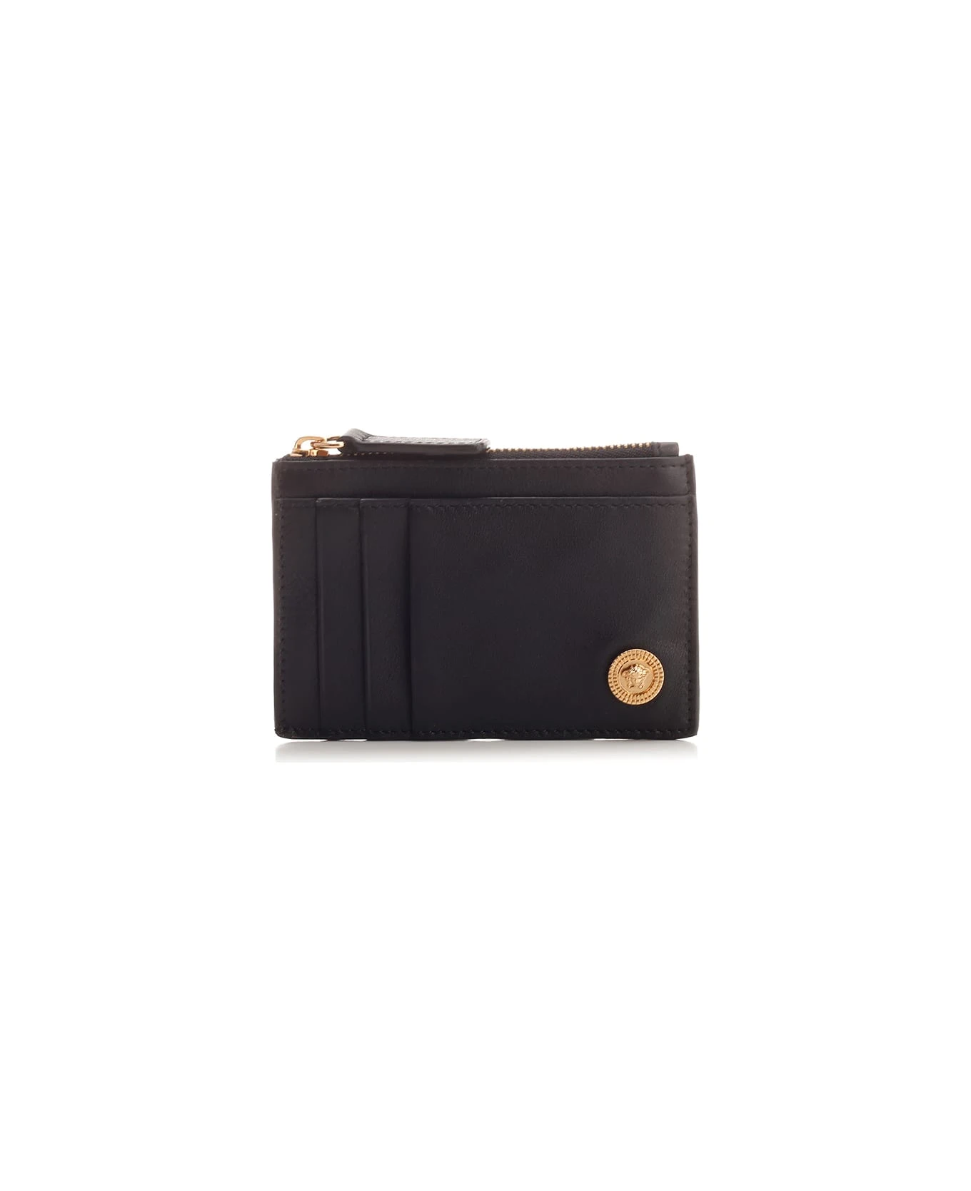 Black “Medusa” leather card holder with gold logo plaque, zip compartment and 6 card slots from Versace.