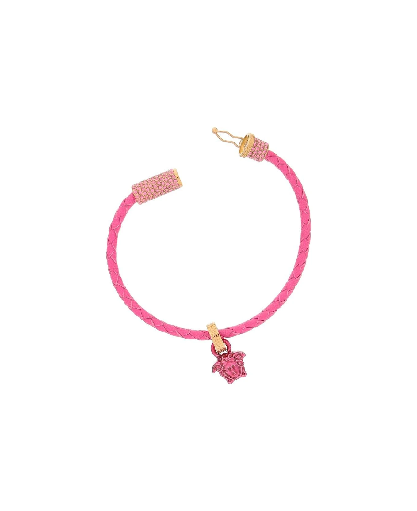 Braided leather bracelet by Versace with Medusa charm and magnetic closure embellished with tone-on-tone crystals. The item in photo is size M.