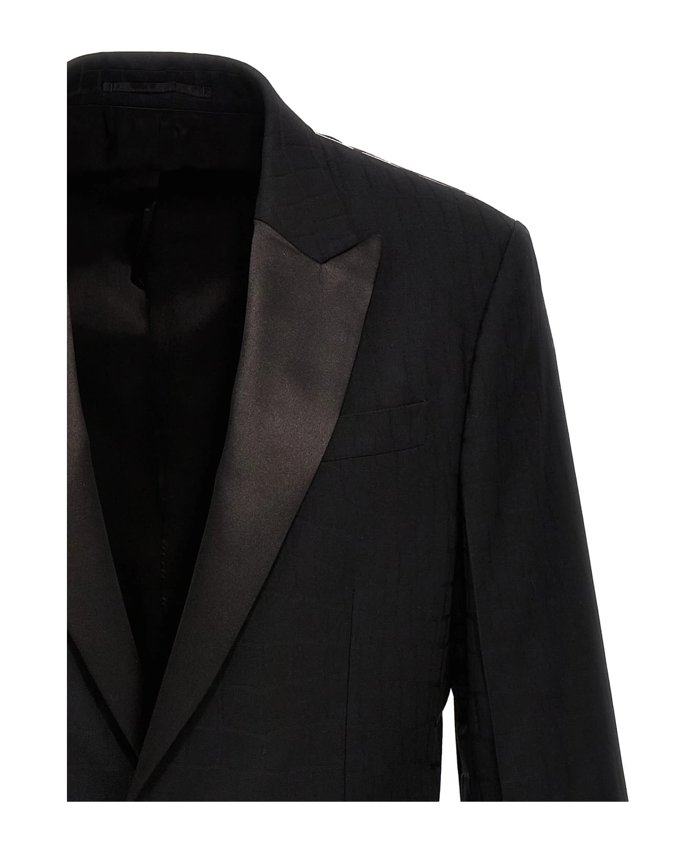 Crocodile-print jacquard wool blazer jacket with single-breasted button closure, satin peak lapels, pockets, long sleeves, back vent.